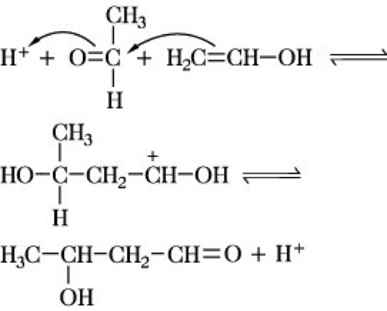 Die säurekatalysierte A. wird durch die Bildung der Enolform der CH-aciden Komponente eingeleitet: