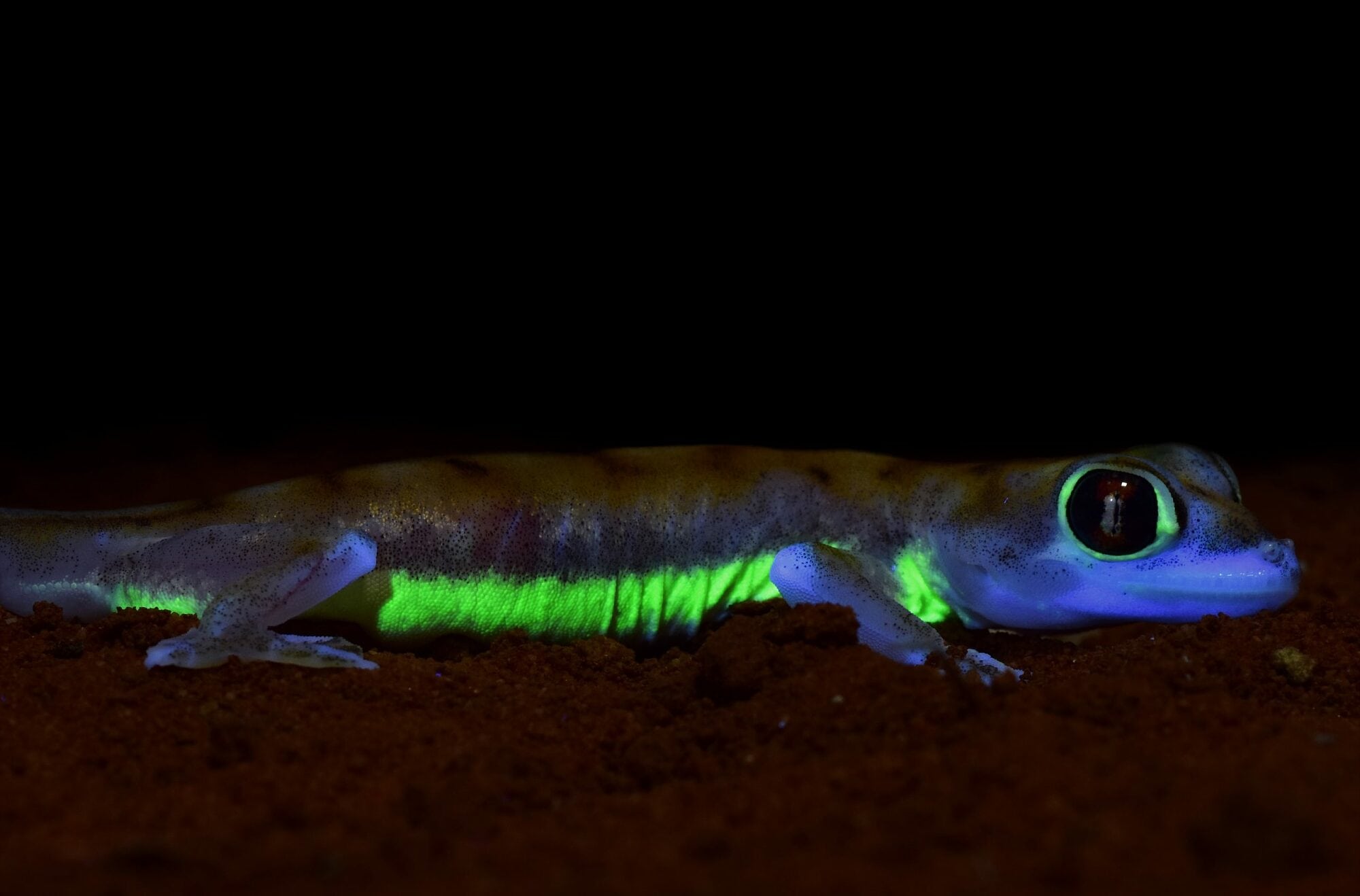 Vor zwei Jahren entdeckte eine Münchner Forschergruppe per Zufall, dass manche Chamäleons in einem satten Blau leuchten, wenn man sie mit einer UV-Lampe bestrahlt. Nach einem solchen Überraschungsfund packt einen natürlich die Entdeckerlust, weshalb das Team um Mark Scherz von der Universität Konstanz seine Lampen bald auch auf alle möglichen anderen Tiere richtete – und erneut fündig wurde: Der Namibgecko (Pachydactylus rangei) kleidet sich entlang seines Bauchs und um die Augen sogar in die stärkste bislang bekannte Fluoreszenz bei Wirbeltieren, schreiben sie nun in »Scientific Reports«. Das grelle Neonleuchten ist wahrlich nicht zu übersehen.