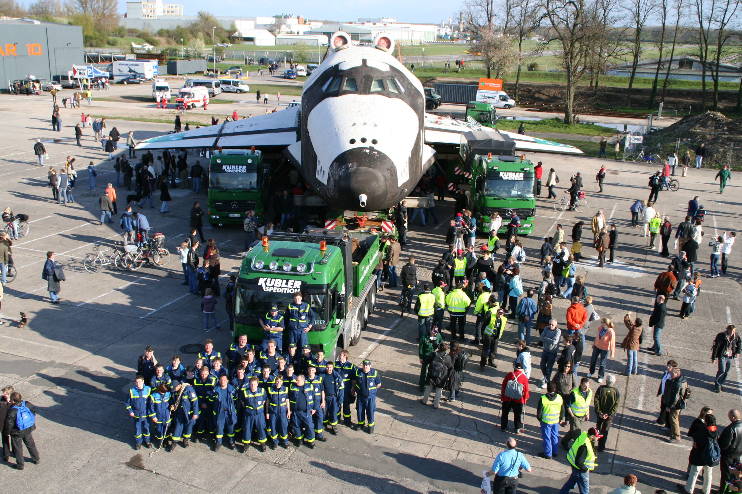 Die Buran an ihrem Ziel, dem Technik Museum Speyer. Nach 1,5 Stunden Straßentransport, schönstem Wetter und jeder Menge Zuschauer, hat es die Buran geschafft.