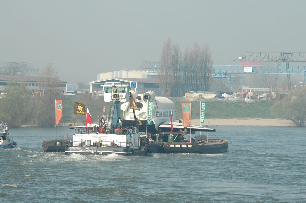 Hier ist der Transport bereits vorbeigefahren und ist gerade in die Rheinschleife um das Düsseldorfer Hafengelände eingebogen. Man kann die Heckseite gut erkennen