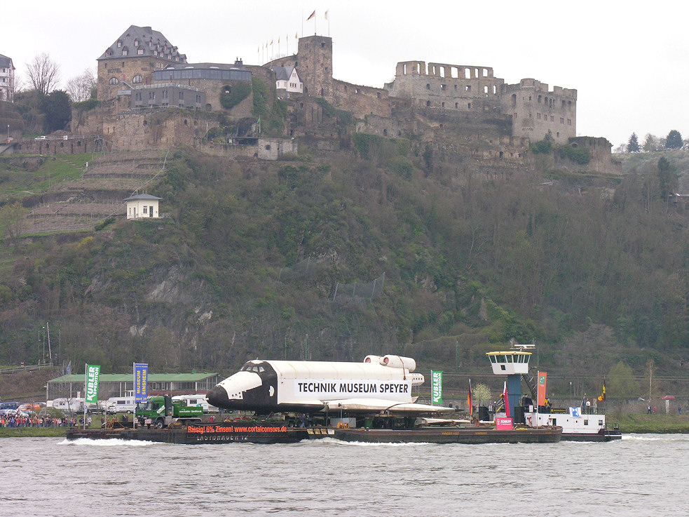 Die Buran unter der Rheinfels, das wollte ich sehen. Ringsum um mich Schüler der benachbarten Schule. Alle warten. Um 11,00 Uhr sollte das Dingen doch an der Loreley vorbei sein. Da, jetzt, da vorne auf dem Rhein. Langsam schiebt sich die Raumfähre auf dem Rhein ins Bild. Sie bleibt stehen, ein Schlepper wird vorgespannt. Los gehts, überall Hubschrauber, Schiffe warten und fahren neben dem Transport her. Alle staunen, anderen klatschen Beifall. Nur die Rheinfels verändert keine Miene. Na, was die schon so alles gesehen hat, da mach auch ein russisches Raumschiff nichts mehr.