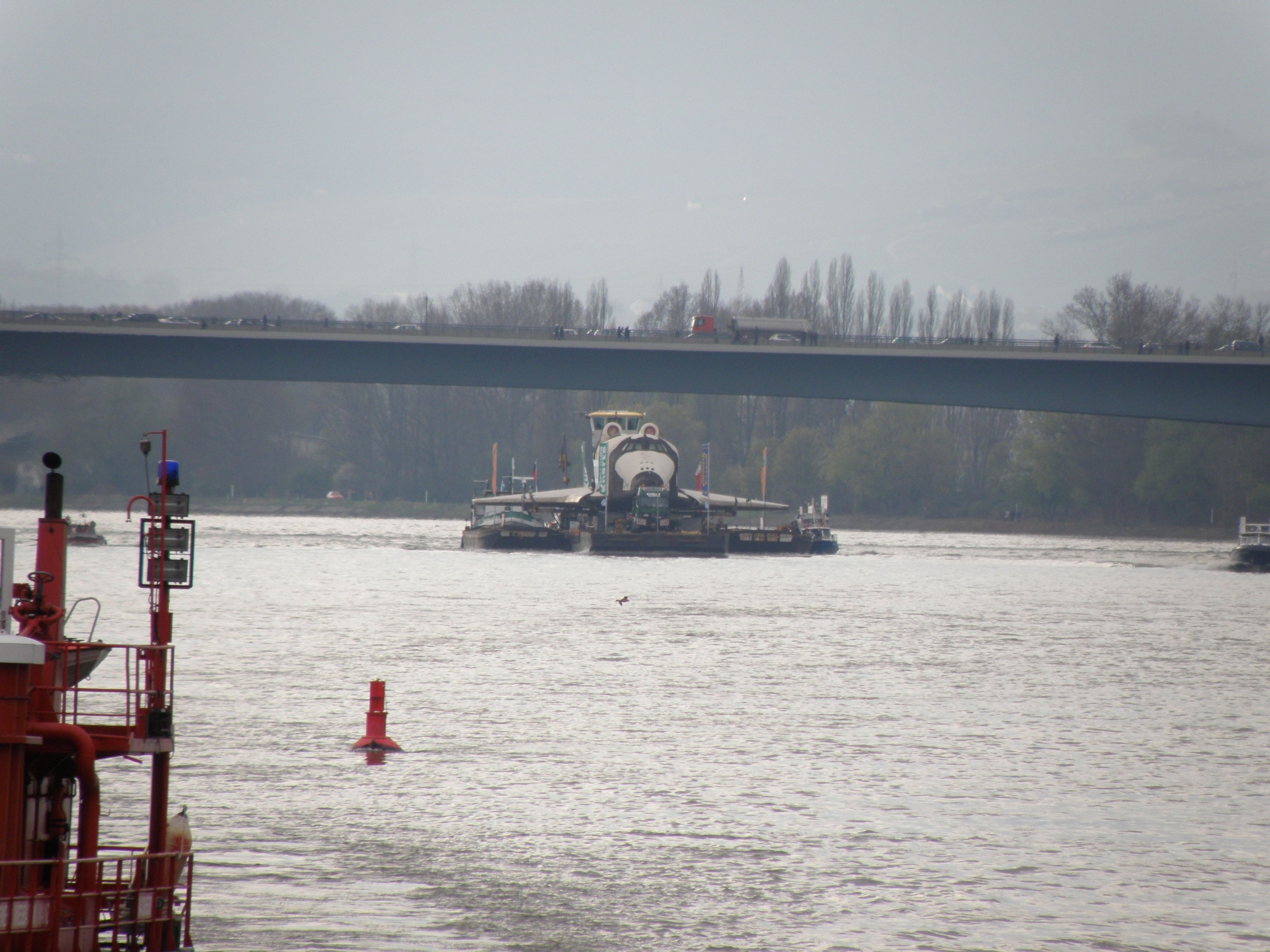 Schiffe gibt es viele auf dem Rhein, aber ein Raumschiff kommt nur selten vorbei. Das bringt dann auch den ganzen Verkehr zum Erliegen, wie hier auf der Schiersteiner Brücke zwischen Mainz und Wiesbaden.