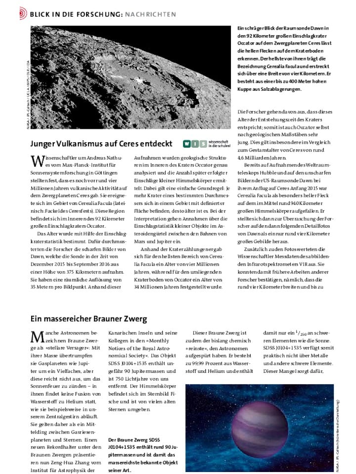Im vorliegenden WIS-Material für die Mittelstufe werden die neuesten Forschungsergebnisse der US-Raumsonde Dawn aufgegriffen. Insbesondere der auf Ceres entdeckte Kryovulkanismus steht dabei im Mittelpunkt der Aufgaben. Das Material enthält ein Arbeitsblatt mit verschiedenen Arbeitsaufträgen zur Einordnung von Ceres als Himmelskörper, zum inneren Aufbau dieses Zwergplaneten, zu den verschiedenen Oberflächenformationen und zur physikalischen Erklärung des Kryovulkanismus. Dabei werden Aufnahmen der Dawn-Mission ausgewertet. In einer projektorientierten Aufgabe wird ein Modell des Kryovulkans Cerealia Facula im Occator-Krater gebaut.