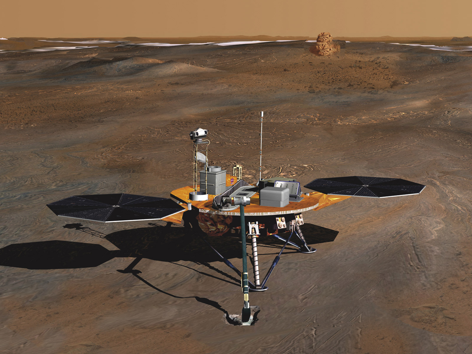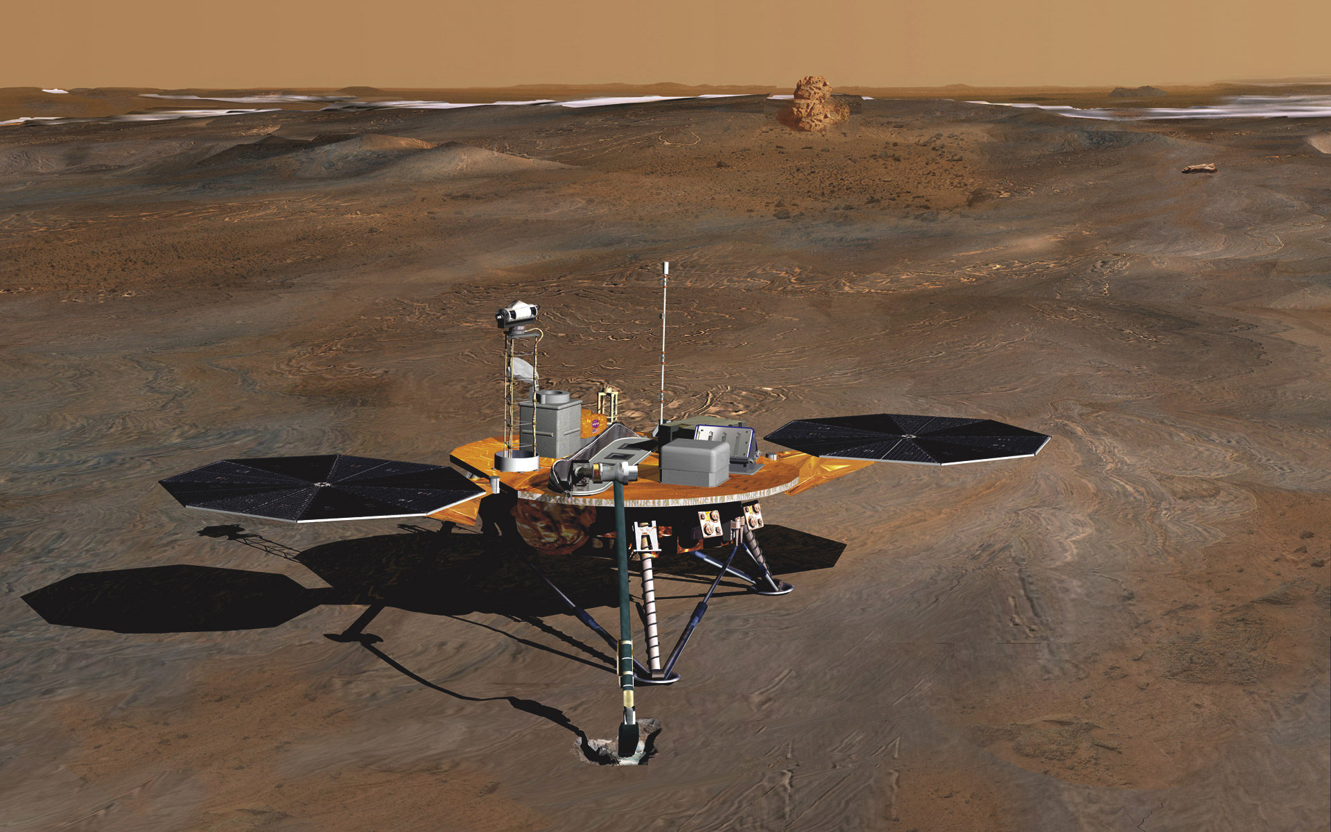 Nein, es ist keine Bohrinsel und kein Baufahrzeug: Was Sie hier sehen, ist die Landeeinheit Phoenix der Nasa. Wenn alles klappt, gräbt sie ab Mitte 2008 im Marsstaub und sucht nach Wasser und Leben.