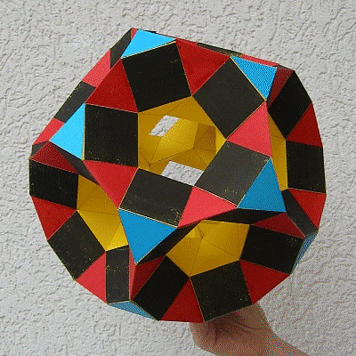 Der andere Körper ist vom gleichen Geschlecht und darf sich ebenfalls der Familie der Fünfzähligen zugehörig fühlen. Er gibt Anlass, das schöne Wort Ikosi-Dodekaeder ausgiebig buchstabieren zu lernen. Denn unter den archimedischen Körpern gibt es erstens das Rhomben-Ikosi-Dodekaeder und zweitens das große Rhomben-Ikosi-Dodekaeder. Letzteres trägt seinen Namen zu Recht, denn es ist – bei gleicher Kantenlänge – in der Tat größer als sein ansonsten gleichnamiger Bruder. Der Kleine besteht aus Fünfecken, Quadraten und Dreiecken, der Große aus Zehnecken, Quadraten und Sechsecken. Und wenn man den Kleinen genau mitten in den Großen setzt, dann – Sie ahnen es schon – kann man an der Stelle jedes Zehnecks eine Grube graben, deren fünfeckiger Boden genau mit den Fünfecken des Kleinen zusammenfällt. In diesem Fall ist diese Grube eine fünfseitige Rotunde, und die ist nichts anderes als – drittens! – ein halbes Ikosidodekaeder. So kommt das edle Stück bei Robert Webb zu seinem Namen "rotunda-drilled great rhombicosidodecahedron" ("rotunden-ausgehöhltes großes Rhomben-Ikosi-Dodekaeder"). Genießen Sie seine Schönheit und vergessen Sie darüber den Bandwurm-Namen.