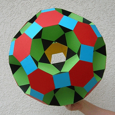 Der eine ist der "ausgehöhlte Dodekaederstumpf" ("drilled truncated dodecahedron" bei Webb). Der Dodekaederstumpf besteht aus zwölf Zehnecken statt der Fünfecke des Dodekaeders und Dreiecken an den Stellen, wo vor dem Entecken die Ecken des Dodekaeders waren. Man grabe an der Stelle jedes Zehnecks eine Grube in Form einer fünfseitigen Kuppel, vertiefe dann jede Grube durch ein fünfseitiges Antiprisma, und siehe da: Die zwölf Schächte treffen sich! Die Fünfecke am Boden jedes Schachtes sind die Flächen eines Dodekaeders, und wenn man das auch noch ausgräbt, dann hat man einen Hohlkörper von wahrlich bedeutendem Geschlecht: 11! Fünfecke sind in ihm allenthalben präsent, aber nur als Löcher. Unter seinen Seitenflächen kommt kein einziges Fünfeck vor, nur Dreiecke und Quadrate.