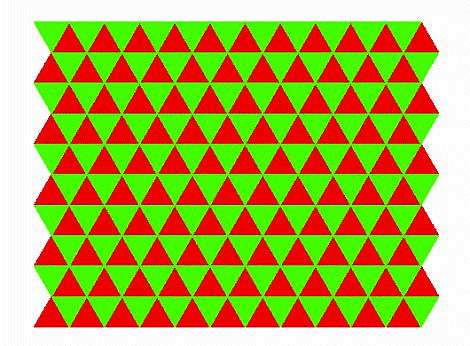 Der Orangenhändler legt die erste Schicht Orangen nicht etwa schachbrettmäßig auf den Boden, sondern im Dreiecksmuster: Jede Orange ist genau von sechs Nachbarn umgeben. Wie passt das zu den Oktaeder-Baumschulen aus der letzten Folge? Man muss eine etwas andere Perspektive einnehmen. Als Grundfläche wähle man nicht, wie bisher, eine Ebene, die lauter Oktaeder halbiert, sondern die Ebene einer Oktaederfläche. Wir haben oben gesehen, dass eine benachbarte Tetraederfläche in derselben Ebene liegt, desgleichen die daran angrenzende Fläche des nächsten Oktaeders, und so weiter. Im Endeffekt haben wir lauter gleichseitige Dreiecke, die dicht an dicht eine ganze Ebene füllen. Man lege die Orangen in die Ecken dieses Dreiecksmusters, die nächste Schicht obenauf "auf Lücke", und siehe da: Orangenhaufen und Raumfüllung mit Tetraedern und Oktaedern laufen auf dasselbe hinaus.