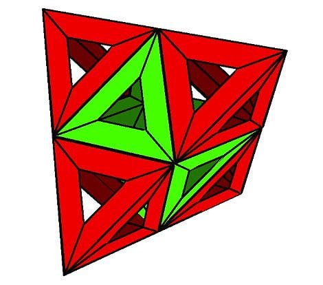 Mehr noch: Benachbarte Seitenflächen verschiedener Körper geraten jeweils in eine Ebene, was nur einem von Millionen amerikanischer Achtklässler und keinem der Testentwerfer aufgefallen war. Daraus ergibt sich – unter anderem – eine interessante Konstruktion: Wenn man nur auf jede zweite Seitenfläche eines Oktaeders ein Tetraeder aufsetzt, erhält man ein Tetraeder der doppelten Kantenlänge.