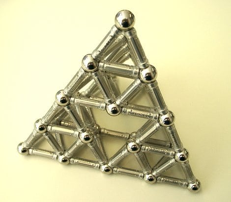 Die Raumfüllung aus Tetraedern und Oktaedern ist so schön, dass sie in vielerlei Verkleidungen vorkommt. Eine hatte ich Ihnen letztes Mal schon gezeigt: Man realisiere die Kanten der Raumfüllung durch Stahlstangen und die Ecken durch Klötze, in die man die Stahlstangen einschraubt, und schon hat man eine Dachkonstruktion für eine Messehalle.
