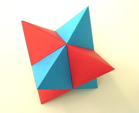 Das ist im Allgemeinen sehr schön und nützlich, aber hier führt eine Beziehung zwischen Tetraeder und Würfel schneller zum Ziel. Von den acht Ecken des Würfels nehme man jede zweite, genauer: Man male eine Ecke eines Würfels rot an; jede Ecke, die mit einer roten Ecke durch eine Kante verbunden ist, male man blau an, und umgekehrt. Das funktioniert, ohne dass man in Widersprüche gerät. Am Ende hat der Würfel vier rote und vier blaue Ecken. Die Ecken einer Farbe zusammen bilden jeweils ein Tetraeder. Beide Tetraeder stecken ineinander, und der aus beiden zusammengesetzte achtspitzige Stern heißt seit Kepler "stella octangula".