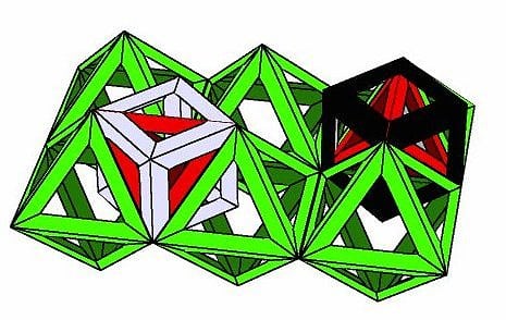 In der letzten Folge hatte ich Ihnen eine spezielle Raumfüllung durch zwei Sorten platonischer Körper vorgestellt: Wenn man auf jede Seitenfläche eines Oktaeders ein Tetraeder gleicher Kantenlänge aufsetzt – Seitenfläche auf Seitenfläche –, die freien Tetraederflächen wieder mit Oktaedern bedeckt und so weiter, dann füllt man auf die Dauer den ganzen Raum lückenlos mit diesen Körpern. An jeder Seitenfläche eines Körpers sitzt ein Körper der jeweils anderen Sorte mit ebenfalls genau einer Seitenfläche.
