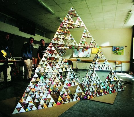 Denken wir jetzt statt von klein nach groß umgekehrt von groß nach klein! Ein großes Tetraeder ist in vier kleine Tetraeder (mit der halben Kantenlänge) zerlegbar, indem man ein Oktaeder, ebenfalls mit der halben Kantenlänge, aus der Mitte herausnimmt. Mit den kleinen Tetraedern verfahren wir jetzt ebenso wie mit dem großen und erhalten 16 ganz kleine Tetraeder, aus denen 64 ganz ganz kleine, und so weiter ... Damit sind wir mitten in der fraktalen Geometrie und landen im Grenzwert beim Sierpinski-Tetraeder, einem höchst bemerkenswerten Gebilde. Mehrere Schulen haben in beeindruckender Gemeinschaftsarbeit riesige Sierpinski-Tetraeder konstruiert.
