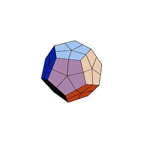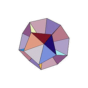 Die offiziellen Namen dieser Sternkörper sind gewöhnungsbedürftig. Der, den ich zuletzt beschrieben habe, heißt "Großes Dodekaeder", obgleich er volumenmäßig kleiner ist als das gewöhnliche Dodekaeder aus denselben zwölf Fünfecken. Der zwanzigspitzige Stern zum Ikosaeder heißt "Großes Sterndodekaeder"; das "Kleine Sterndodekaeder" ist dafür wirklich aus dem Dodekaeder entstanden, zwölfspitzig und verglichen mit seinem großen Bruder wirklich noch etwas pummelig. Ein "Großes Ikosaeder" gibt es auch, aber das ist eine ganz andere Geschichte.
