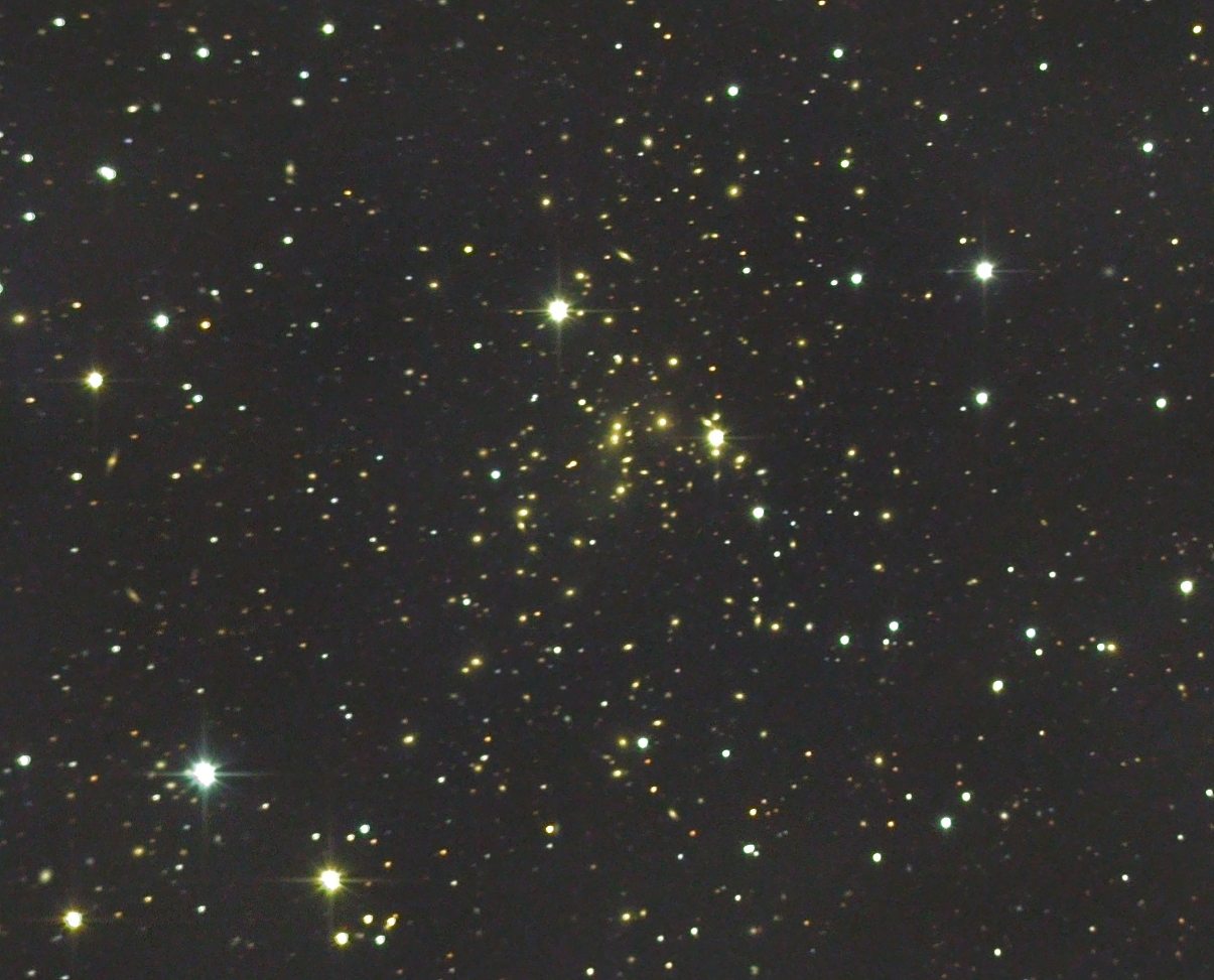 400-mal weiter entfernt als die Andromedagalaxie finden wir den Galaxienhaufen Abell 2065 in der Nördlichen Krone. Die hellsten sechs Galaxien weisen 16 mag auf und können gerade in einem 16-Zoll-Teleskop erahnt werden. Der Galaxienhaufen besteht hauptsächlich aus E- und SO Typen. In mehreren Anläufen konnte ich diese Aufnahme mit ingesamt fast zehn Stunden Belichtungsdauer gewinnen.