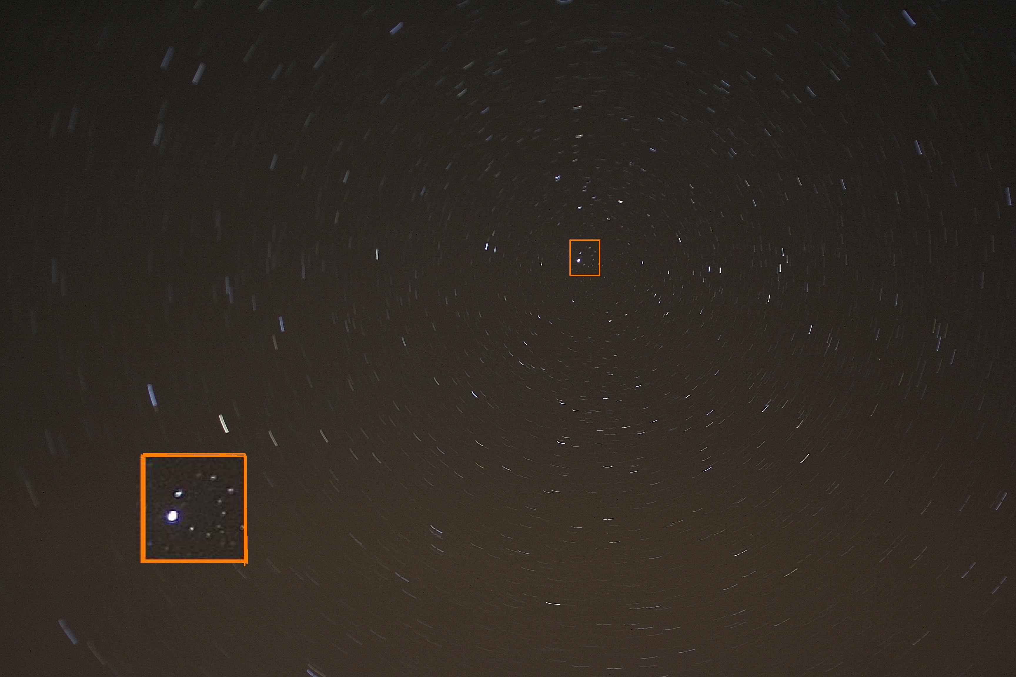 Unter besten Bedingungen belichtete ich mithilfe eines selbst gebastelten Tischstatives die Zirkumpolarregion. Deutlich sieht man den kleinen Wagen. Im Ausschnitt erkennt man den Polarstern und Harrington1, eine sichelförmige Sternenkette, die zufällig genau in dieser Sichtlinie liegt und den Anschein erweckt, als würde sie den Polarstern umschließen.