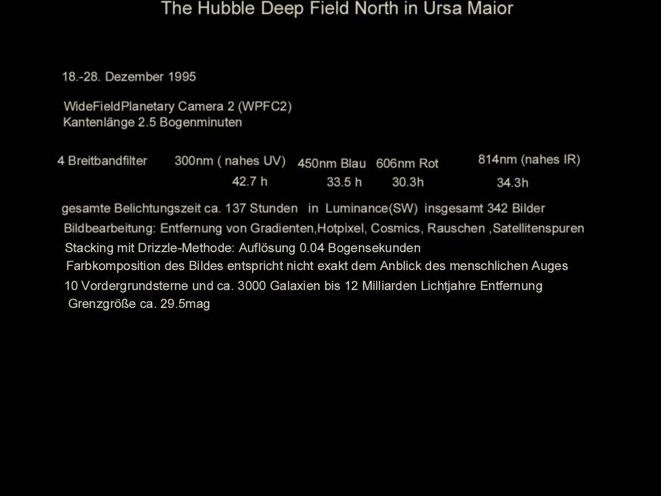 Seit dem Beginn meiner CCD-Astrofotografie im Jahr 2006 hatte ich die fixe Idee, die Grenzen meines 8" F4.5 Newton-Teleskops auszuloten. Zusammengesetzt aus Bauteilen, die ich in den 1980er Jahren aus den USA importiert hatte, lag es seit geraumer Zeit unbenutzt in der Ecke und drohte zu verstauben. Ursprünglich ein glühender Mond-Fan, der mit einem 9"-Takahashi SCT und später mit einem importierten C14 in der 2003 neu errichteten Kuppel unzählige Bilder und Videos, auch von den Planeten, schoss, begeisterten mich die neuen CCD-Aufnahmen von Galaxien, die wesentlich leichter und mit unerhörten Details aufgenommen werden konnten, als mit der mühevollen analogen Emulsionstechnik. So tauschte das alte Newton-Teleskop den Platz mit dem C14.In einem der vielen CCD-Astrofotografiebücher entdeckte ich im Jahr 2007 ein Bild vom Hubble Deep Field Nord, das mit einem C14 und einer Megatec Camera 18 Stunden belichtet wurde und eine Grenzgrößenklasse von 23,8 mag erreichte. Es gab daneben genaue Helligkeitsangaben von den aufgenommenen Galaxien und Feldsternen im HDF (Blau- und Rothelligkeiten). Nun wollte ich wissen,wie viele von den enthaltenen Galaxien ich wohl erreichen konnte. Im Frühjahr 2008 gelang mir dann eine vierstündige Aufnahme, auf der ich tatsächlich einige Galaxien, die im erwähnten Buch zu sehen waren, entdecken konnte. Die Grenzgröße ermittelte ich damals zu 21 mag. Immer wieder wollte ich mehr Frames aufnehmen, wurde aber immer abgelenkt von der Jagd nach den ach so vielen anderen, größeren und schöneren Galaxien am Himmel. Im April 2022 entschloß ich mich endlich vier Nächte zu opfern, um das HDFN endlich abhaken zu können, insgesamt 16 Stunden und zusammen also ingesamt 20 Stunden Expositionszeit. Hier einige Daten zum HDF Nord, siehe auch eine genaue Beschreibung in Wikipedia!