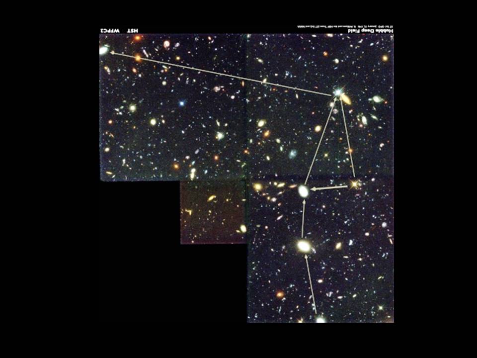 Hier ein Bild des HDFN, Norden ist oben, so wie das Bild zur Ansicht orientiert ist. Eingezeichnet sind einige markante Verbindungslinien zwischen hellen Galaxien bzw. Sternen zur Orientierung. Das hellste Objekt (zweites von unten) ist eine Galaxie (20 mag).