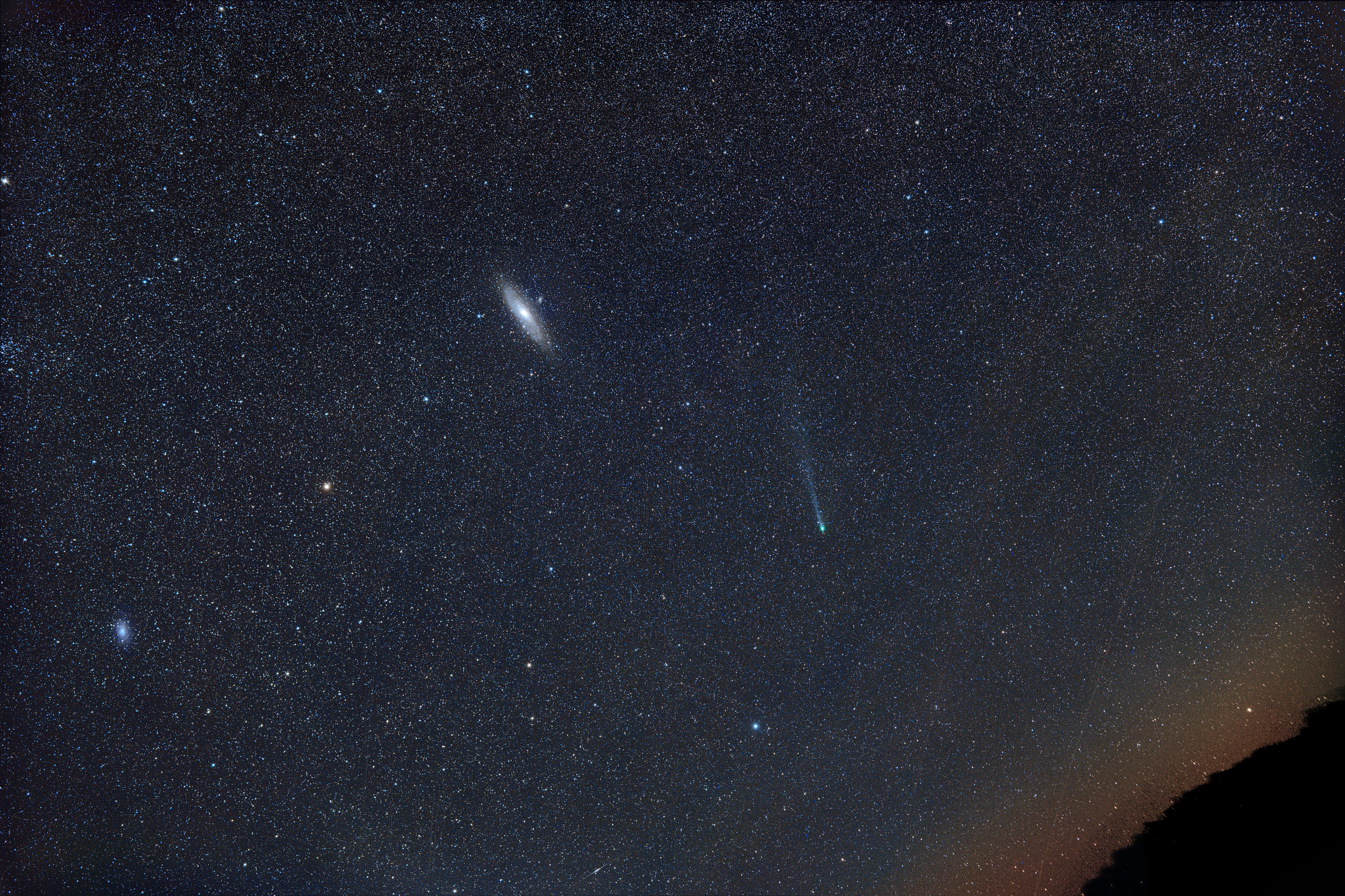 12P/Pons-Brooks zieht in nächster Zeit unterhalb der Andromeda-Galaxie in Richtung der Dreiecksgalaxie (ganz links im Bild). Schon jetzt zeigt der knapp nicht freisichtige Komet einen Schweif von mehr als fünf Grad. Aufnahme von einem weitgehend streulichtfreien Platz an der österreichisch-tschechischen Grenze.
