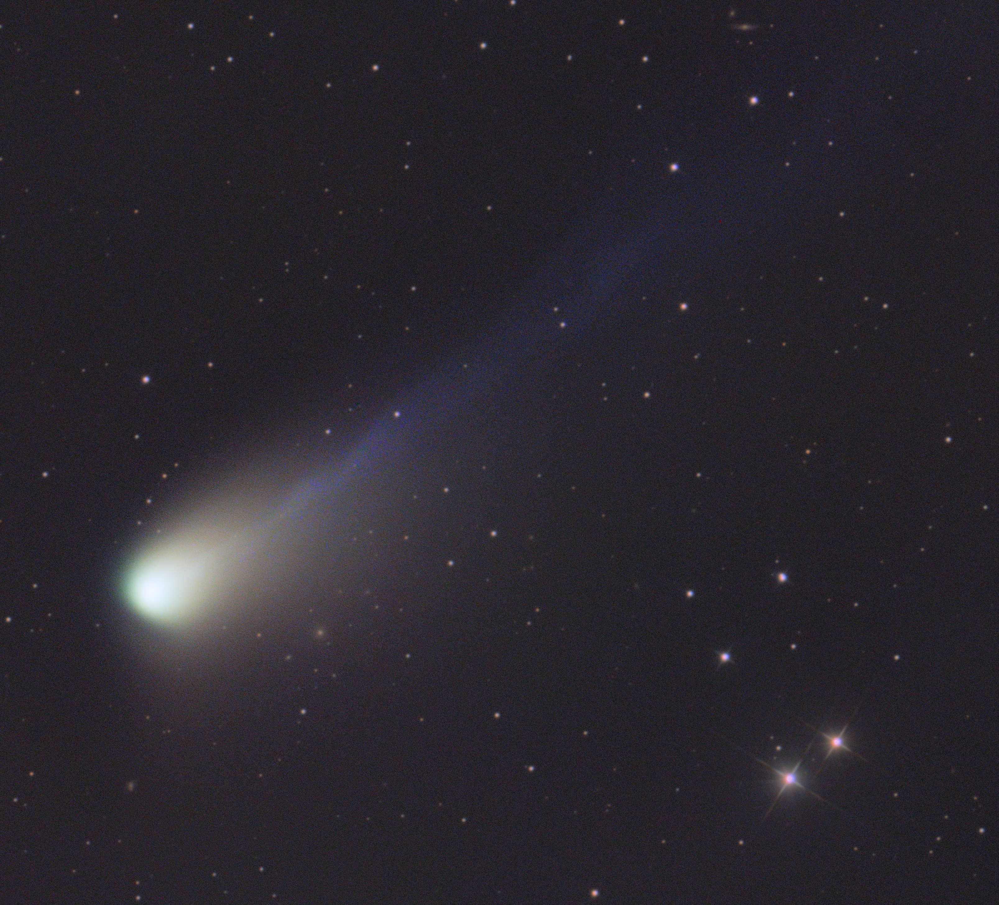 Der Komet steht sehr tief am Horizont, jedoch war mir das Glück diesmal hold, und ich hatte vom Garten aus durchs Gebüsch gute Sicht darauf :)