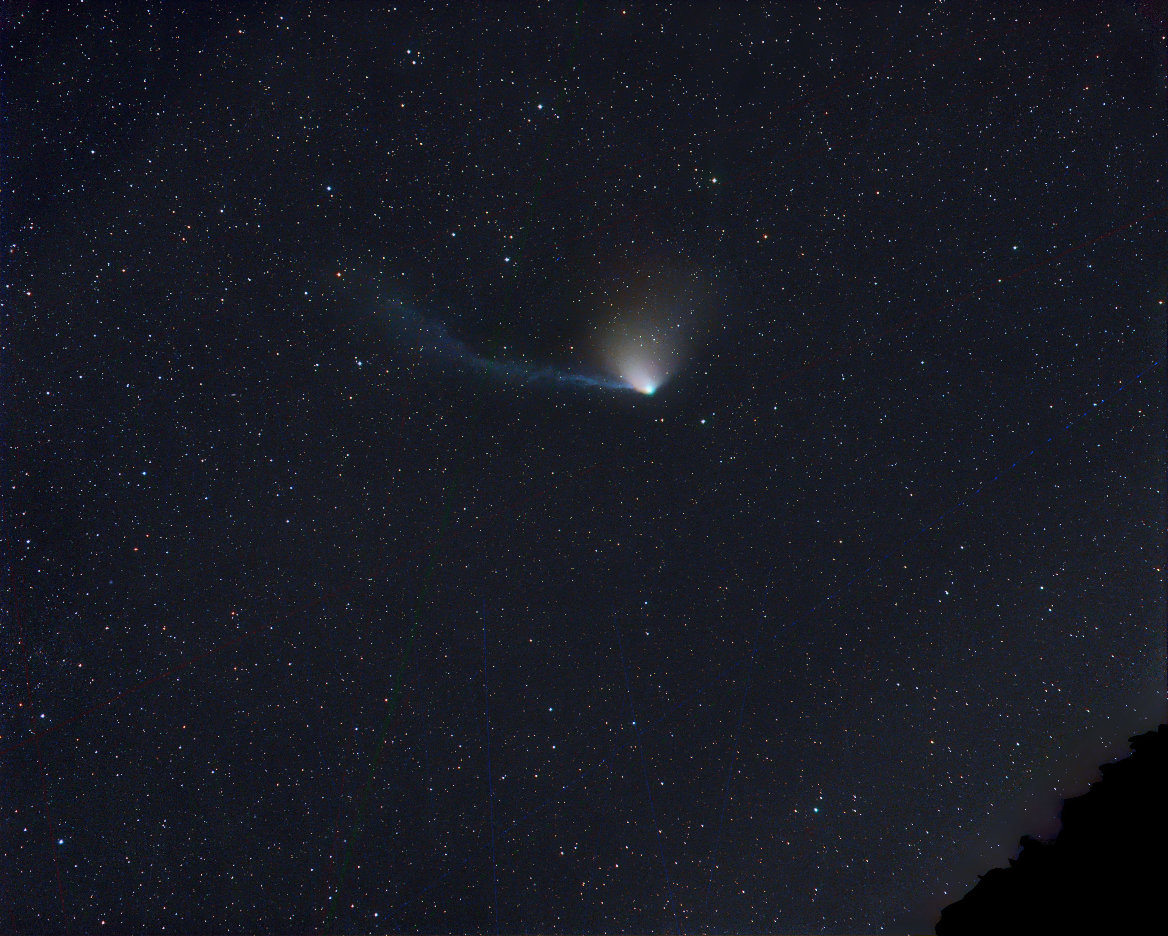 Auch wenn Komet 13P/Olbers 2 AE von der Erde entfernt steht, zeigt er erst auf Übersichtsaufnahmen seine beiden Schweife in voller Pracht. Am 6. August war sein Ionenschweif >3 und sein Staubfächer rund 1,5 Grad lang