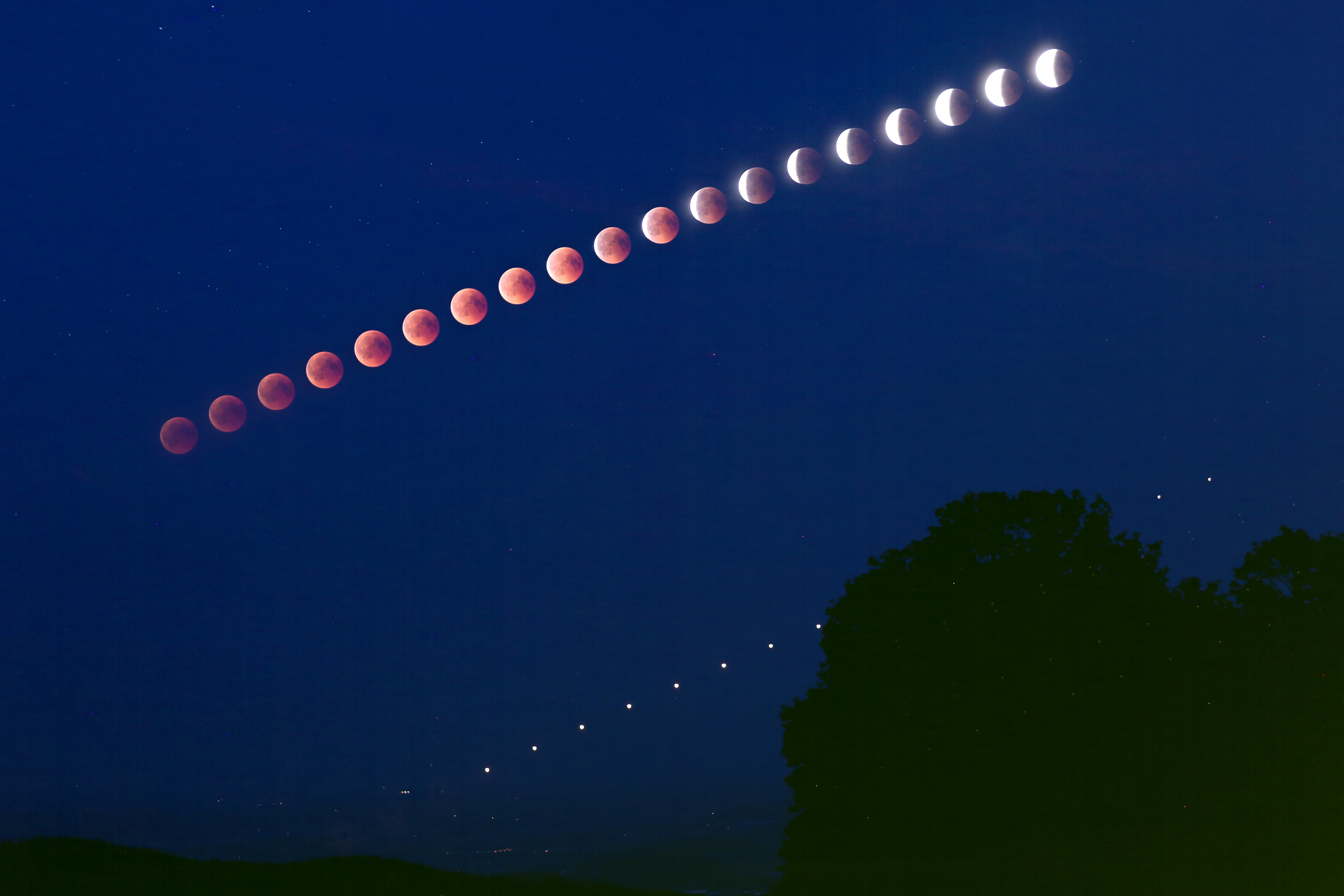 In dreiminütigem Abstand fotografierte ich den Mond am Abend der Mondfinsternis von 22:49 bis 23:44 Uhr MESZ. Da der Mond immer heller wurde, musste ich die Belichtungszeit von anfänglich zwei Sekunden auf 1/8 Sekunde reduzieren.