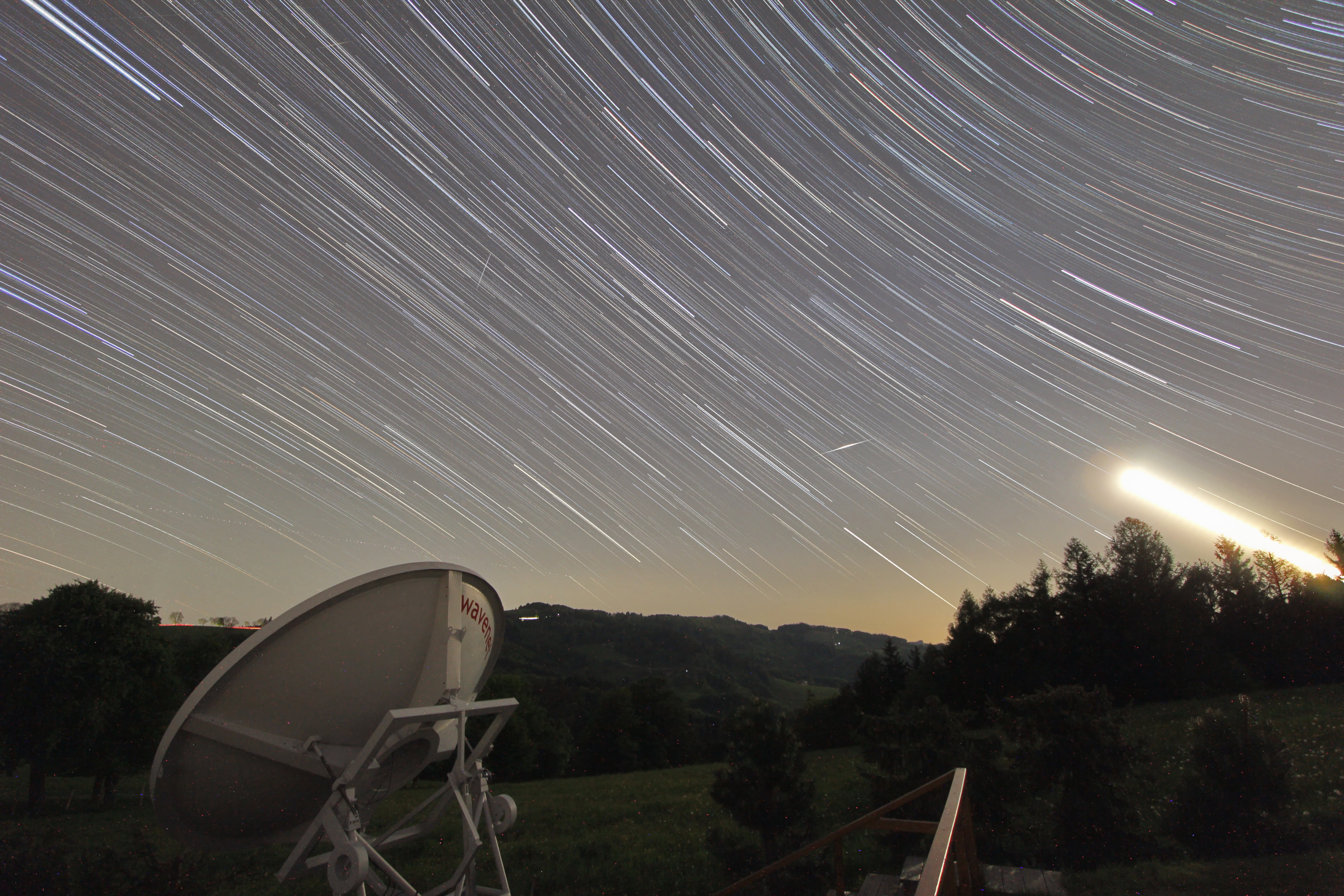 Habe mit der Aufnahme in Richtung des Himmelsäquators versucht darzustellen, wie sich die Strichspuren südlich und nördlich des Himmelsäquators um den jeweiligen Himmelspol "drehen", im Vordergrund befindet sich das 3m Radiotelsekop des Verein Antares.