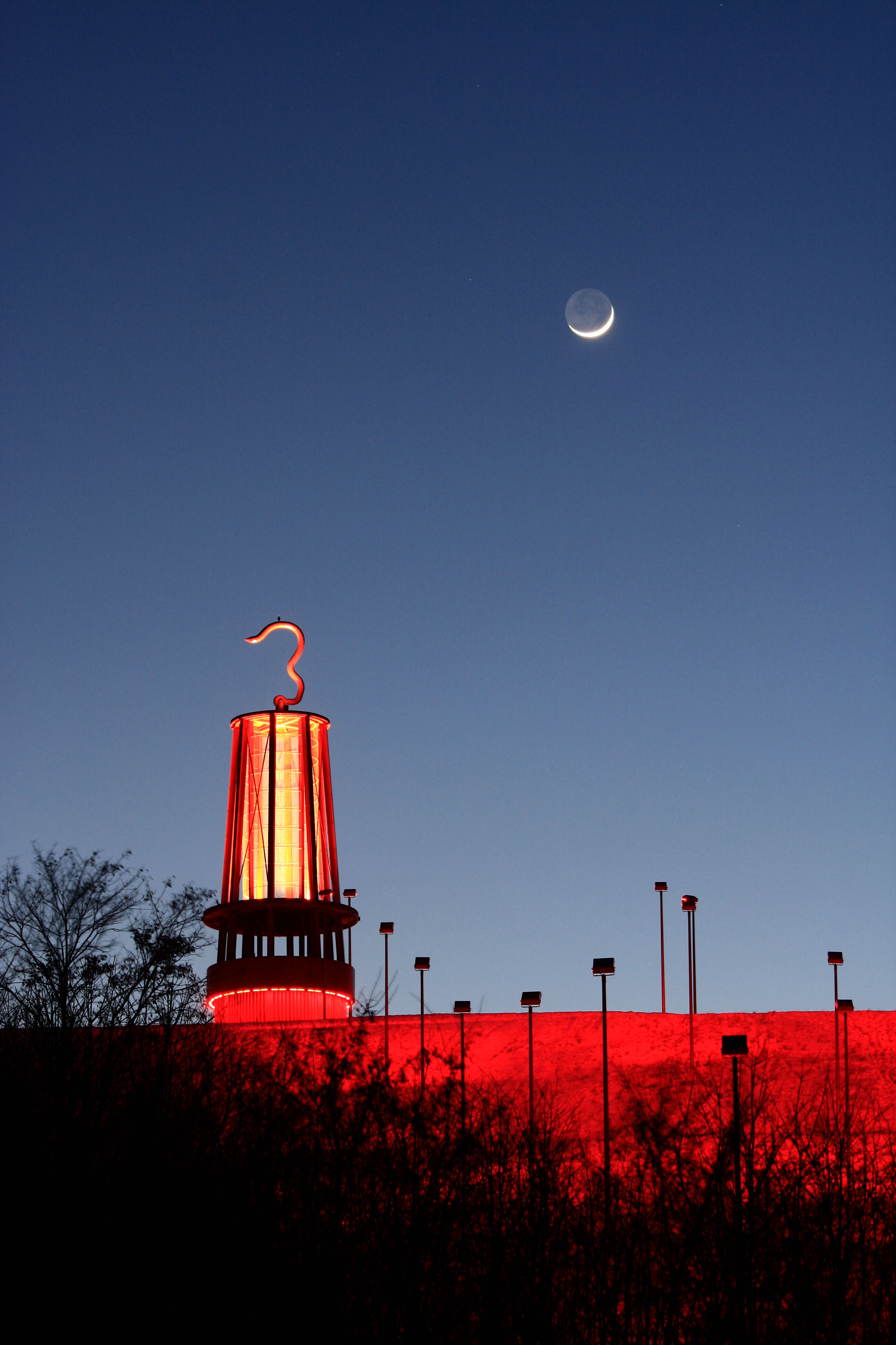 Auf der Rheinpreußenhalde in Moers wurde eine ca. 15 Mater hohe Grubenlampe als Landmarke errichtet. Sie wird abends illuminiert und bildete heute Abend einen reizvollen Kontrast zur schmalen Mondsichel