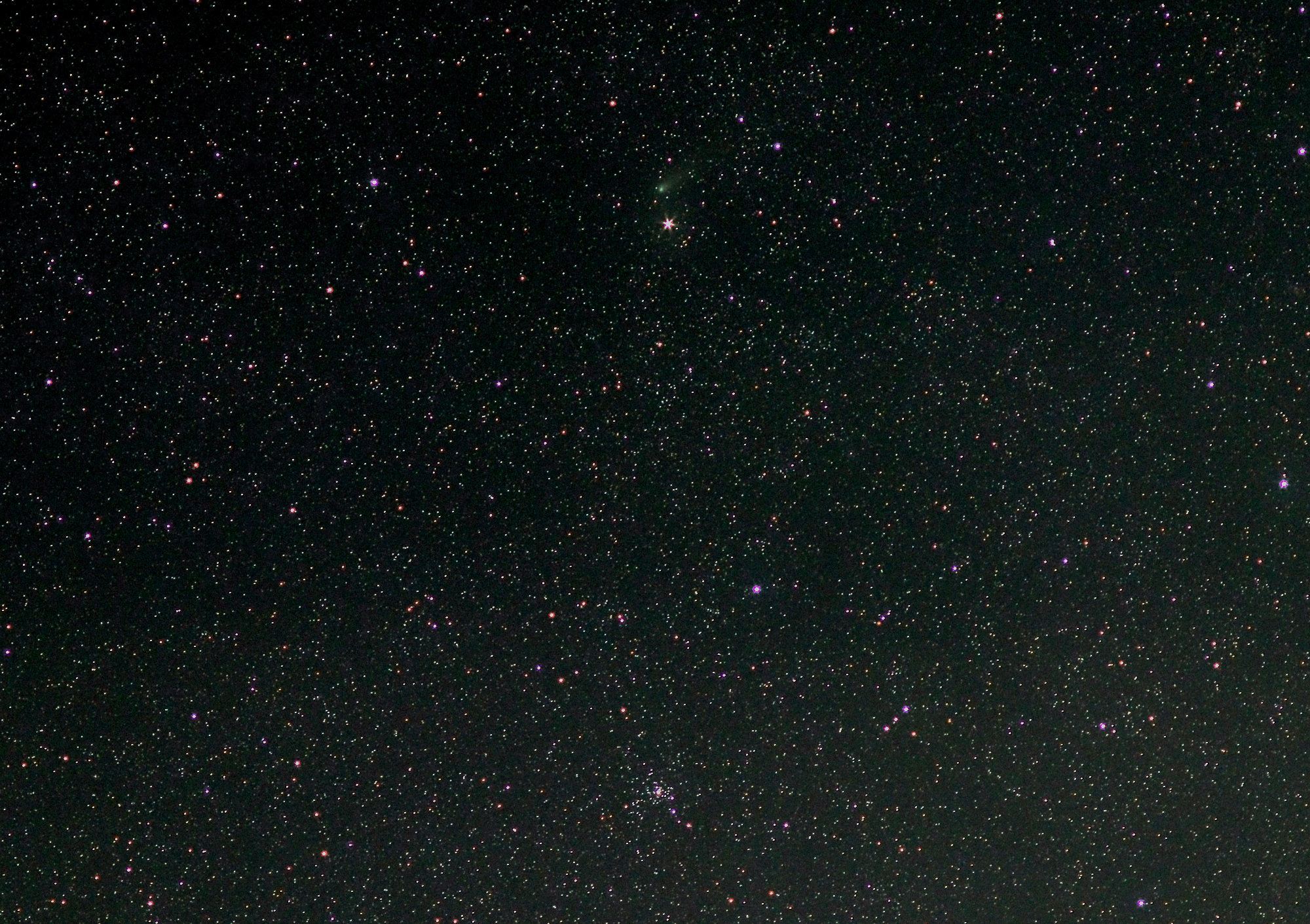 Nein, es war nicht ganz einfach, ihn nur mit dem Teleobjektiv ohne Teleskop zu finden. Das hier gezeigte Bild entstand am Morgen des 29. September 2018 bei Fastvollmond (83 Prozent Beleuchtung) und durchziehender Cirrusbewölkung. Außerdem war die Helligkeit von 21P auf 8,0 mag gesunken. Dennoch erkennt man einen leichten Schweifansatz. Der Helle Stern direkt unterhalb des Kometen ist 18 Mon. Unten im Bild befindet sich der offene Sternhaufen NGC 2301.