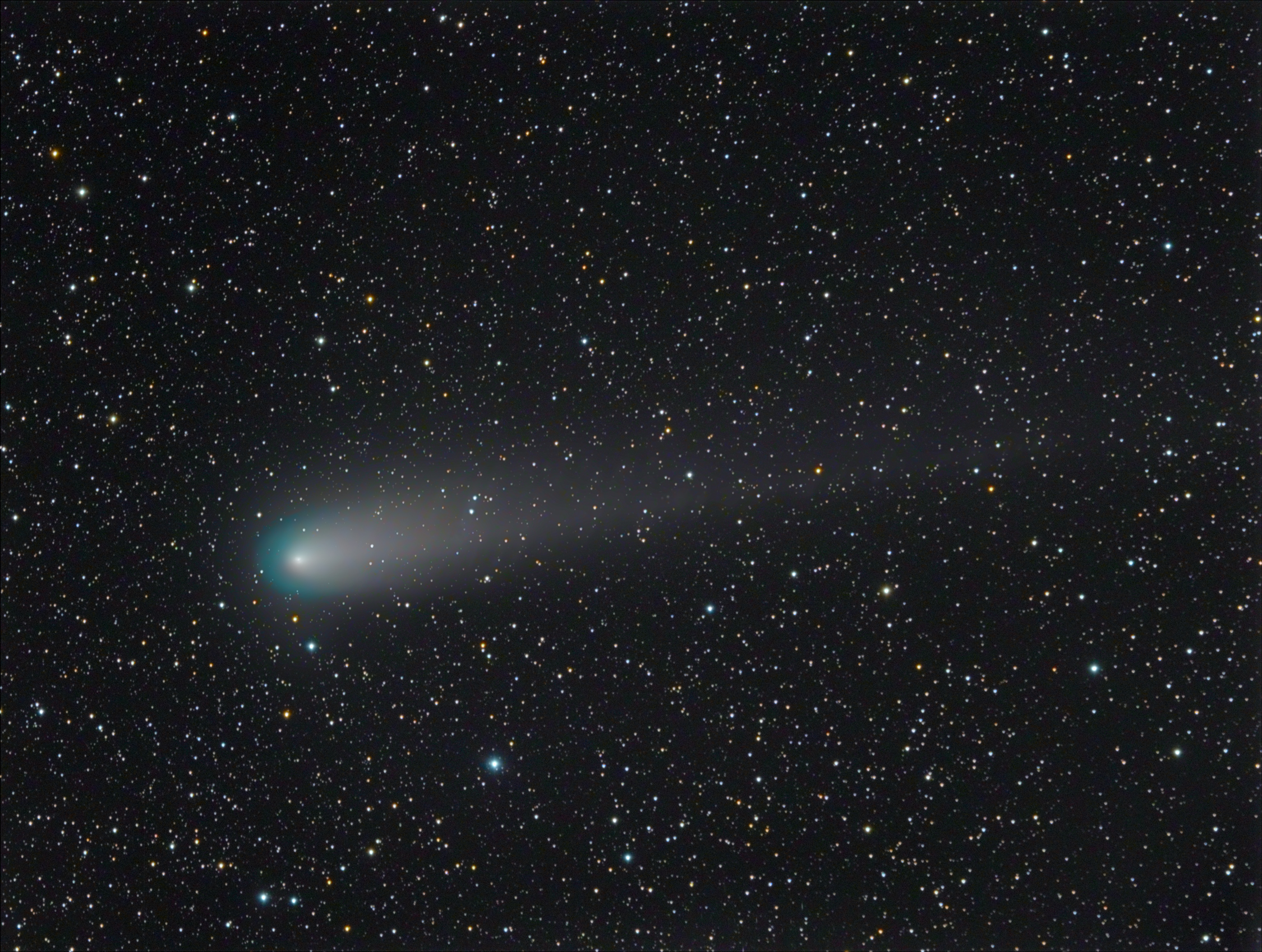 Der Komet Giacobini-Zinner war Mitte September 2018 am Morgen hervorragend zu beobachten. Seine Schweiflänge war größer als der Monddurchmesser. Seine Koma war sehr ausgeprägt und türkis gefärbt. L und RGB Informationen wurden an zwei Teleskopen gleichzeitig aufgenommen.