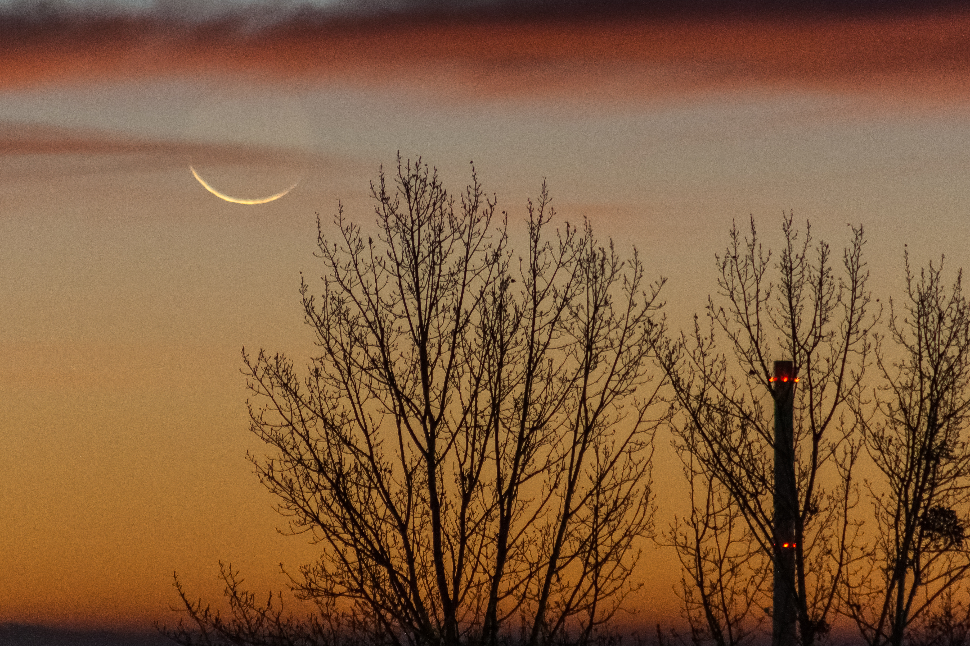 Letzte Sichtbarkeit der sehr dünnen Mondsichel knapp 23 Stunden vor Neumond. Kurz danach zog der Himmel zu.