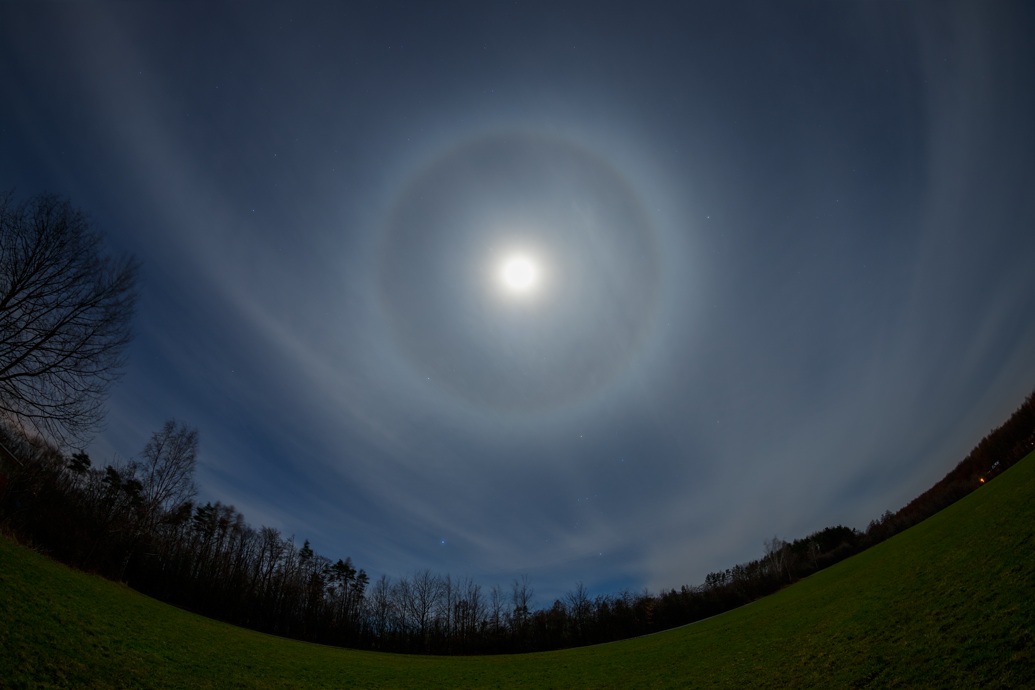 Wunderschöner 22-Grad-Ring um den Mond, nahezu die ganze Nacht. Herrlich wars auf dem Feld zu stehen, das kräftige Rauschen des Waldes, die milde Luft … Mondhöhe: 60 Grad. Weitere Haloerscheinungen konnte ich nicht entdecken.