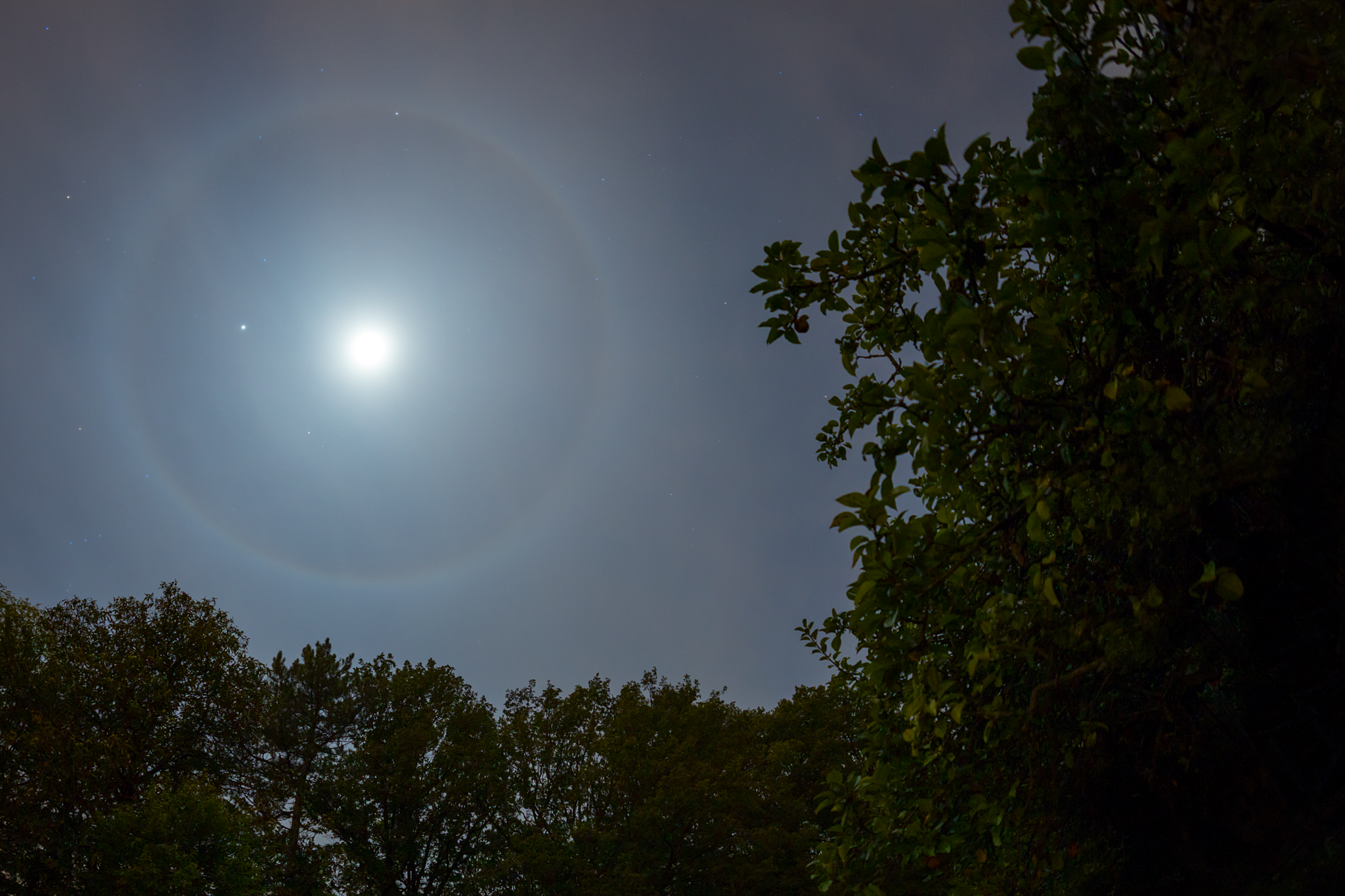 Heute morgen umschloß ein prachtvoller 22-Grad-Ring Mond und Jupiter gleichzeitig. Ich war schon auf dem Weg zur Arbeit, als ich den herrlichen Halo um beide Himmelsobjekte sah. Also noch mal schnell Kamera mit Fisheye ausgestattet…
