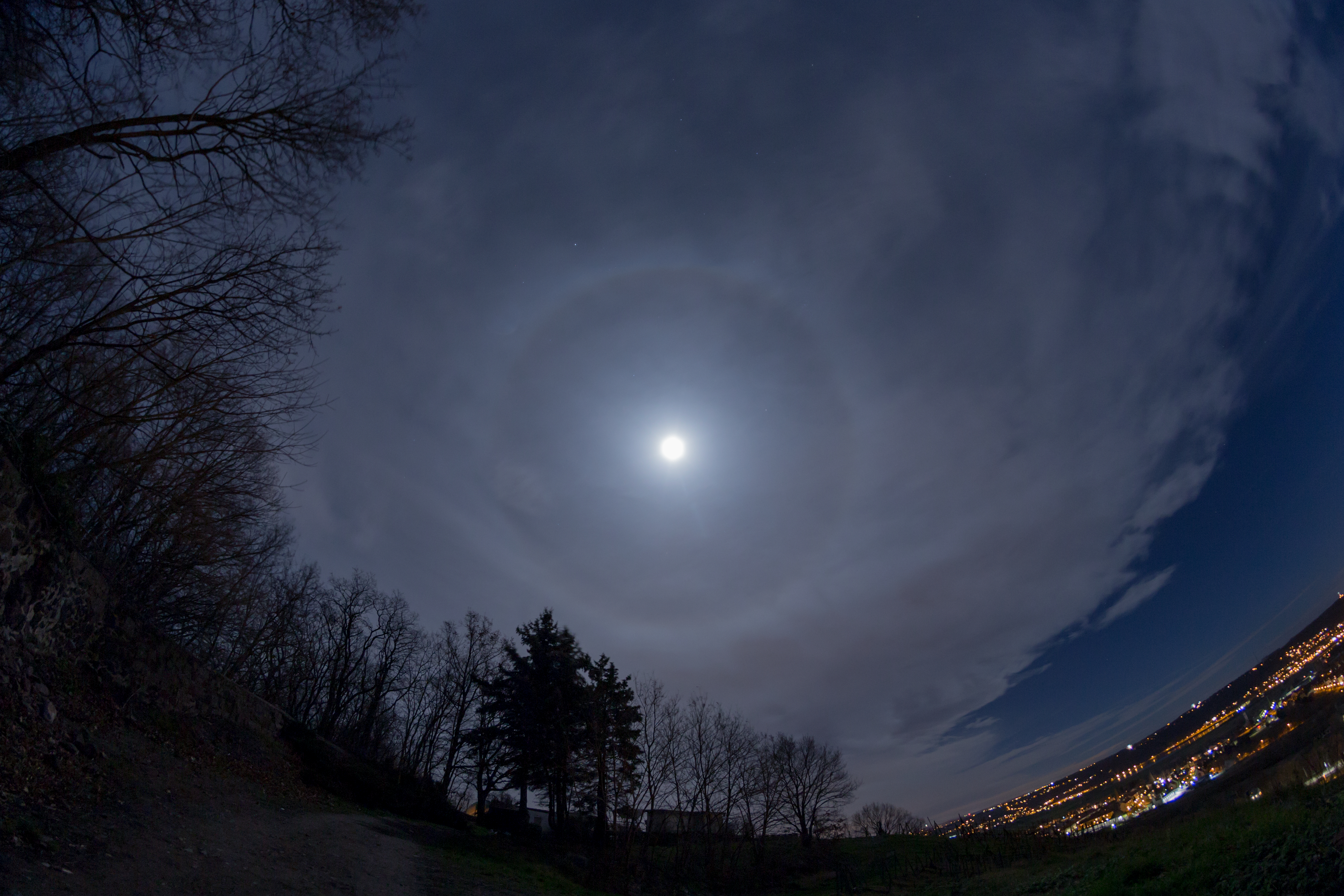 Einen wunderschönen Jahresausklang bot das Jahr 2017 an der Sternwarte Radebeul in Sachsen während der Silvesterfeier des Vereins. Angenehm milde Luft mit +12 Grad Celsius und eine fantastische Fernsicht versprachen einen wunderbaren Blick auf das Feuerwerk um Mitternacht über dem Dresdner und Radebeuler Elbtal. Doch zuvor – in den letzten Stunden des ausklingenden Jahres – zeigte der Himmel noch einmal, was er kann: einen prächtigen 22°-Ring um den Mond. Der hellste Stern des Bildes ist Kapella. Das große wolkenfreie Gebiet rechts entstand durch Föhn am Erzgebirge…