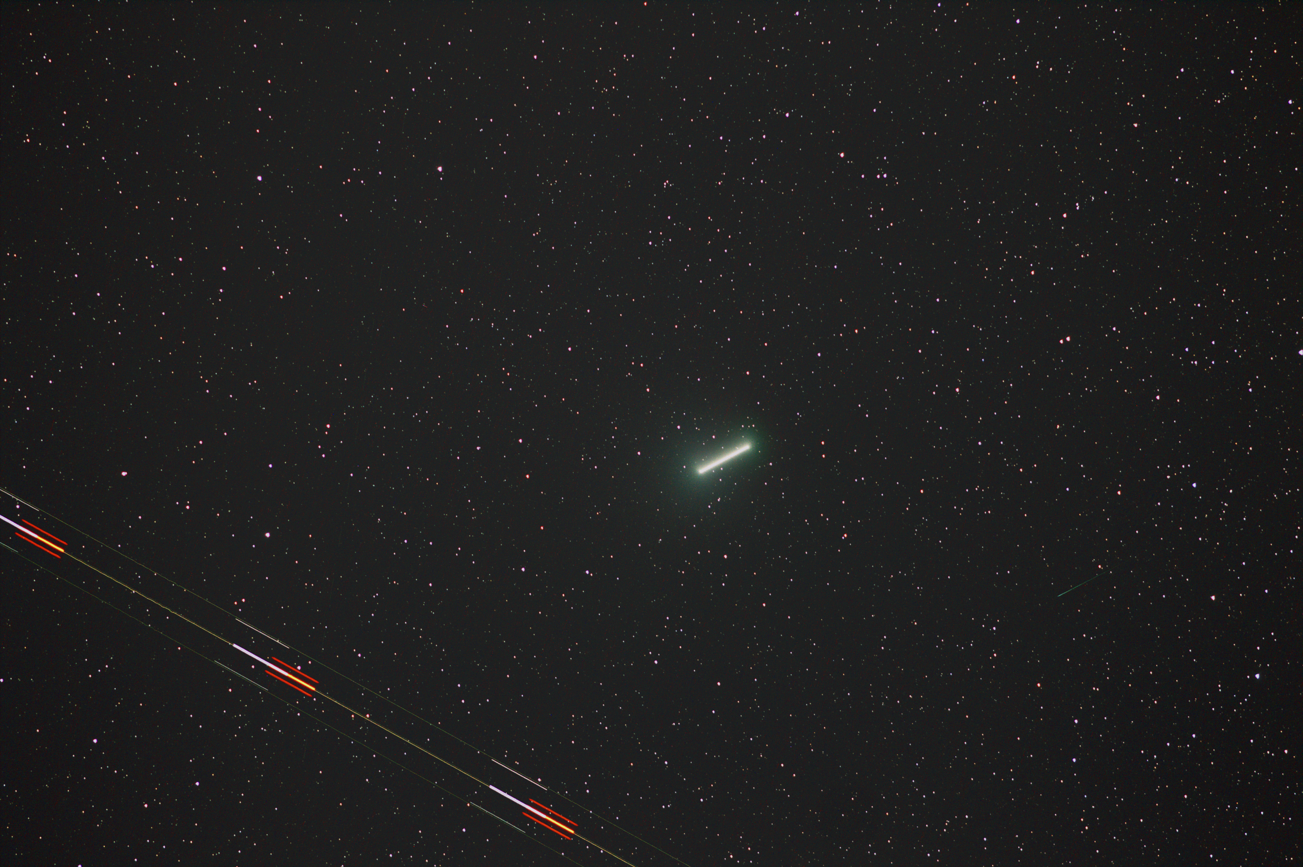 Am Abend des 15. Dezember 2018 von 20:22 Uhr bis 21:51 Uhr MEZ wurde eine Serie von 72 Bildern zu je 30 s Belichtung mit 30 s internem Dark und 15 s Pause angefertigt. Der Komet 46P/Wirtanen ist ja schon hinlänglich bekannt. Entdeckt wurde er 1948 vom US-Astronomen C.A. Wirtanen. Sein Durchmesser wird auf 555 m geschätzt. Der kurzperiodische Komet hat nach zwei näheren Begegnungen seine Umlaufperiode von 6,7 auf 5,5 Jahre verkürzt. Den Bahnverlauf des Asteroiden (267) Tirza ist in der unteren Bildhälfte auf der rechten Seite zu sehen. Er wurde von Auguste Charlois am 27. Mai 1887 in Nizza entdeckt. Tirza hat einen Durchmesser von 53 km.