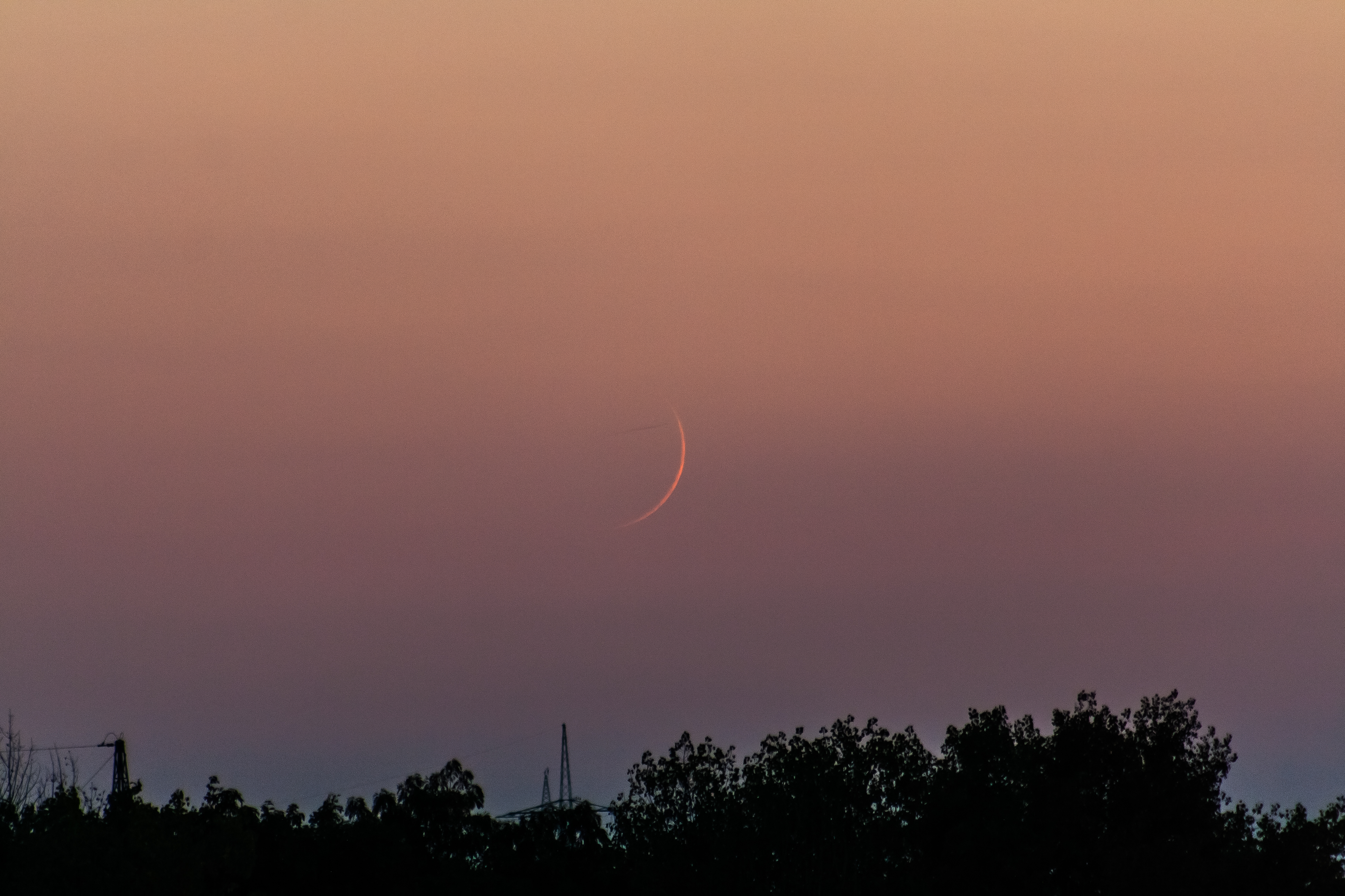 Erste Sichtbarkeit der jungen Mondsichel gut 32 Stunden nach Neumond. In den Dunstschichten am Horizont war die Mondsichel gerade so zu sehen. [Mondhöhe: 2,6° / Sonnenhöhe: -6,2°]