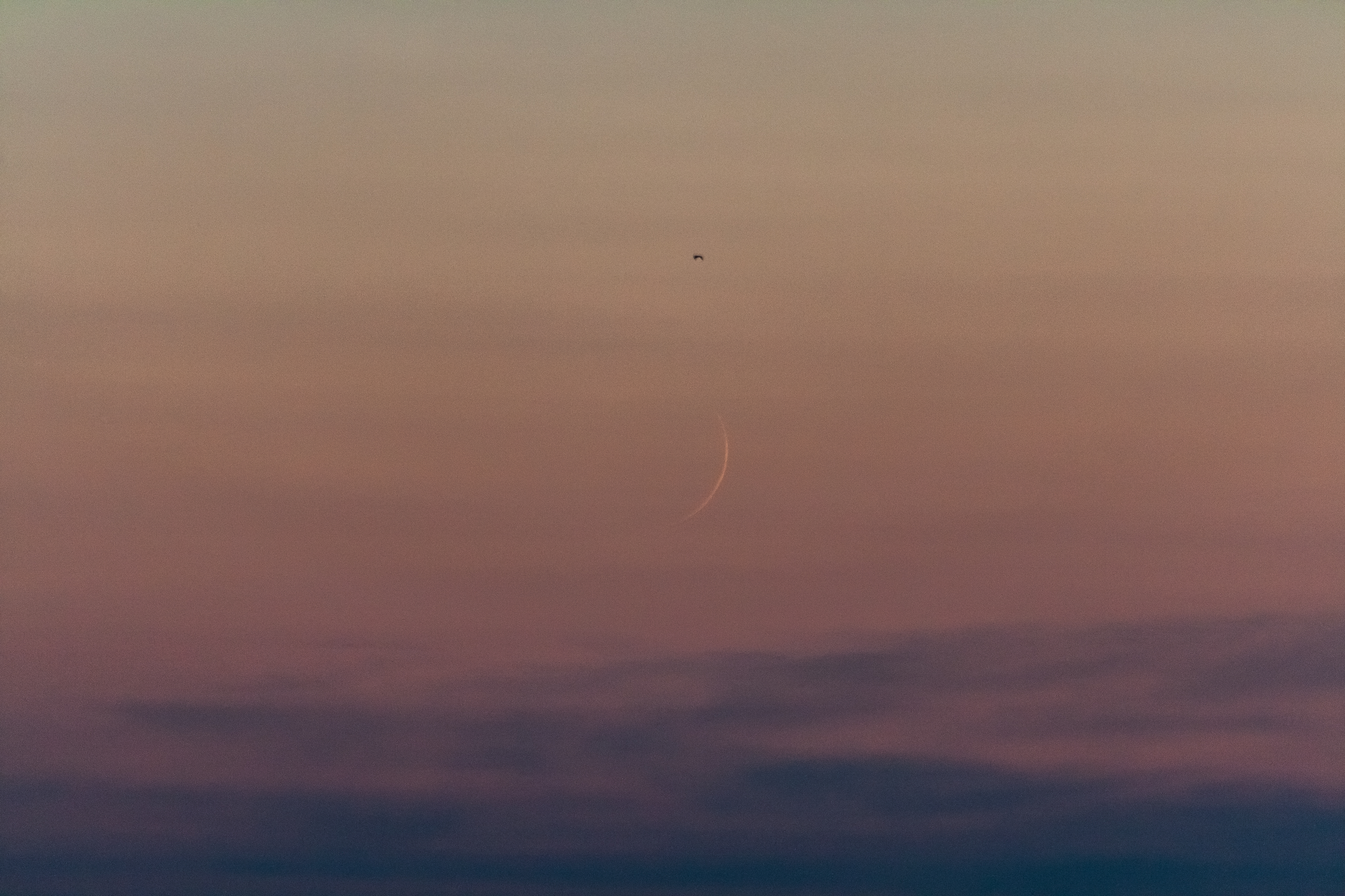 Erste Sichtbarkeit der jungen Mondsichel gut 34 Stunden nach Neumond. Der immer noch sehr helle Abendhimmel und die Wolken am Horizont waren keine gute Voraussetzung, um die hauchdünne Mondsichel aufzuspüren. Mondhöhe: 3,8 Grad; Sonnenhöhe: -4,7 Grad