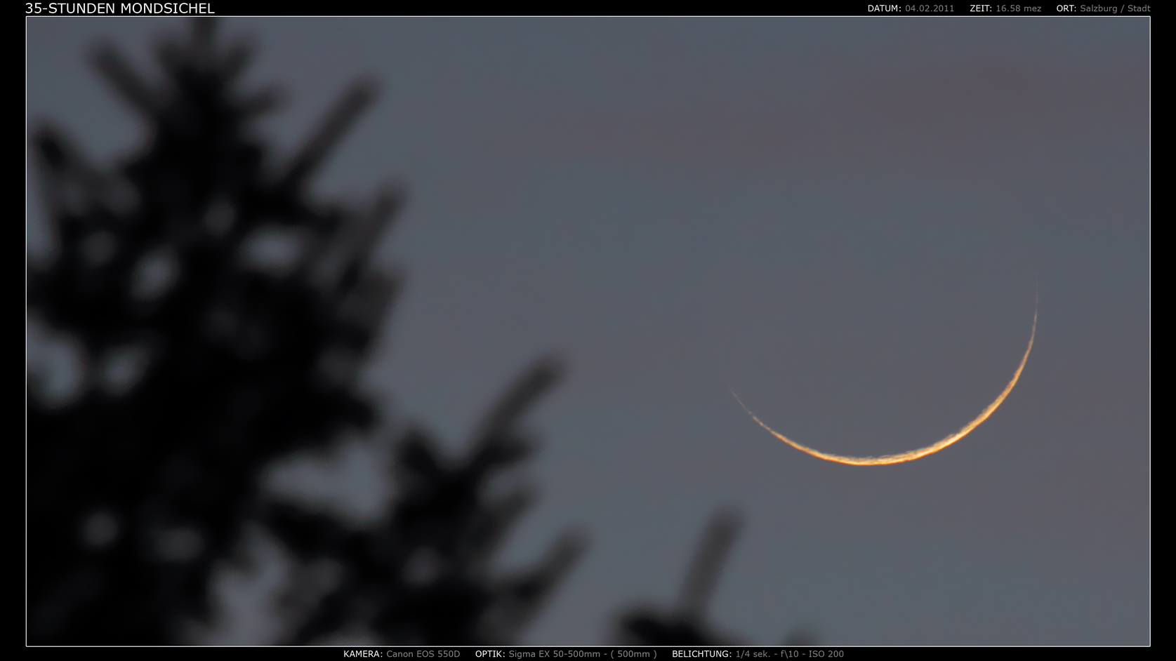 Bei einem Blick aus dem Fenster kurz vor Sonnenuntergang konnte ich gestern abend die 1. Abendsichtbarkeit der nur 35 Stunden alten Mondsichel fotografisch festhalten. Dies ist bis dato meine jüngste Sichel-Fotografie!