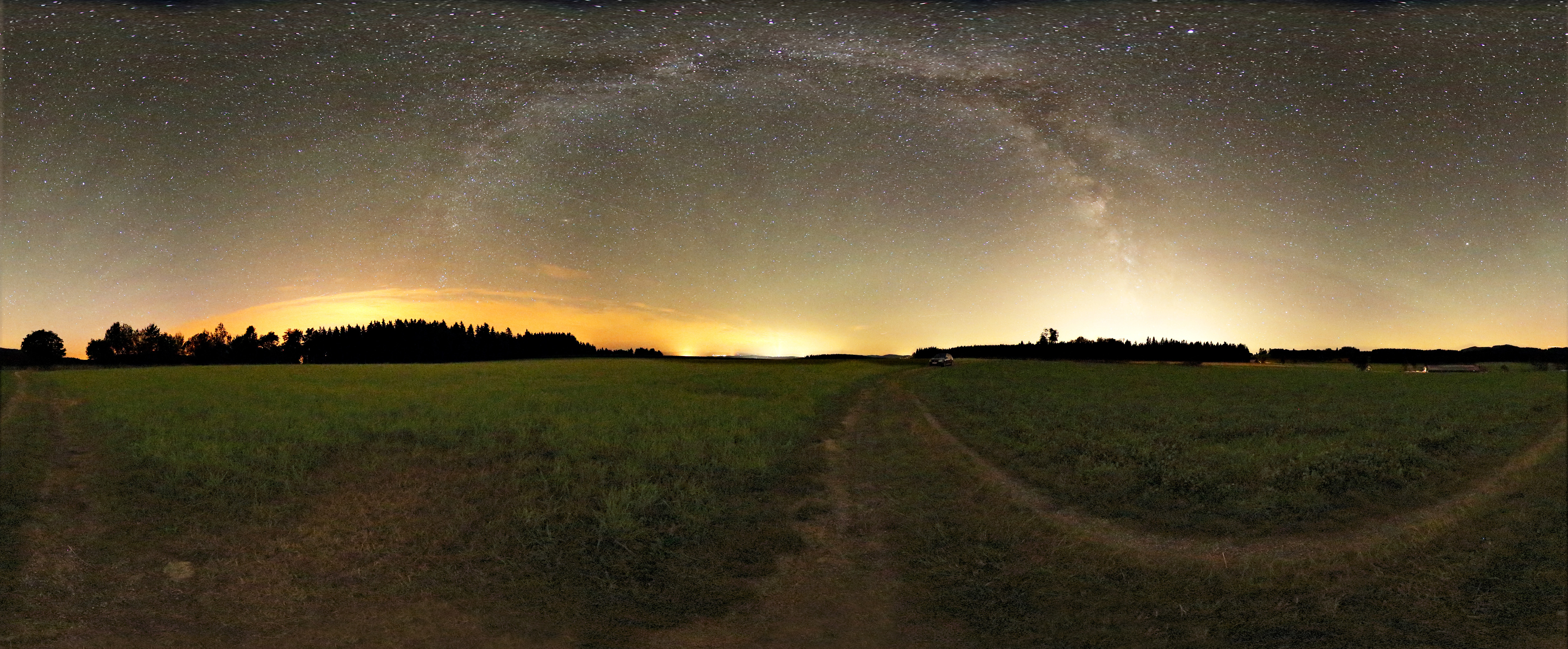 Dies ist meine erste 360-x-180-Grad-Nachtaufnahme. Leider ist die Lichtverschmutzung im Süden (Linz) deutlich zu sehen. Ein Hauch von airglow ist zu erkennen.