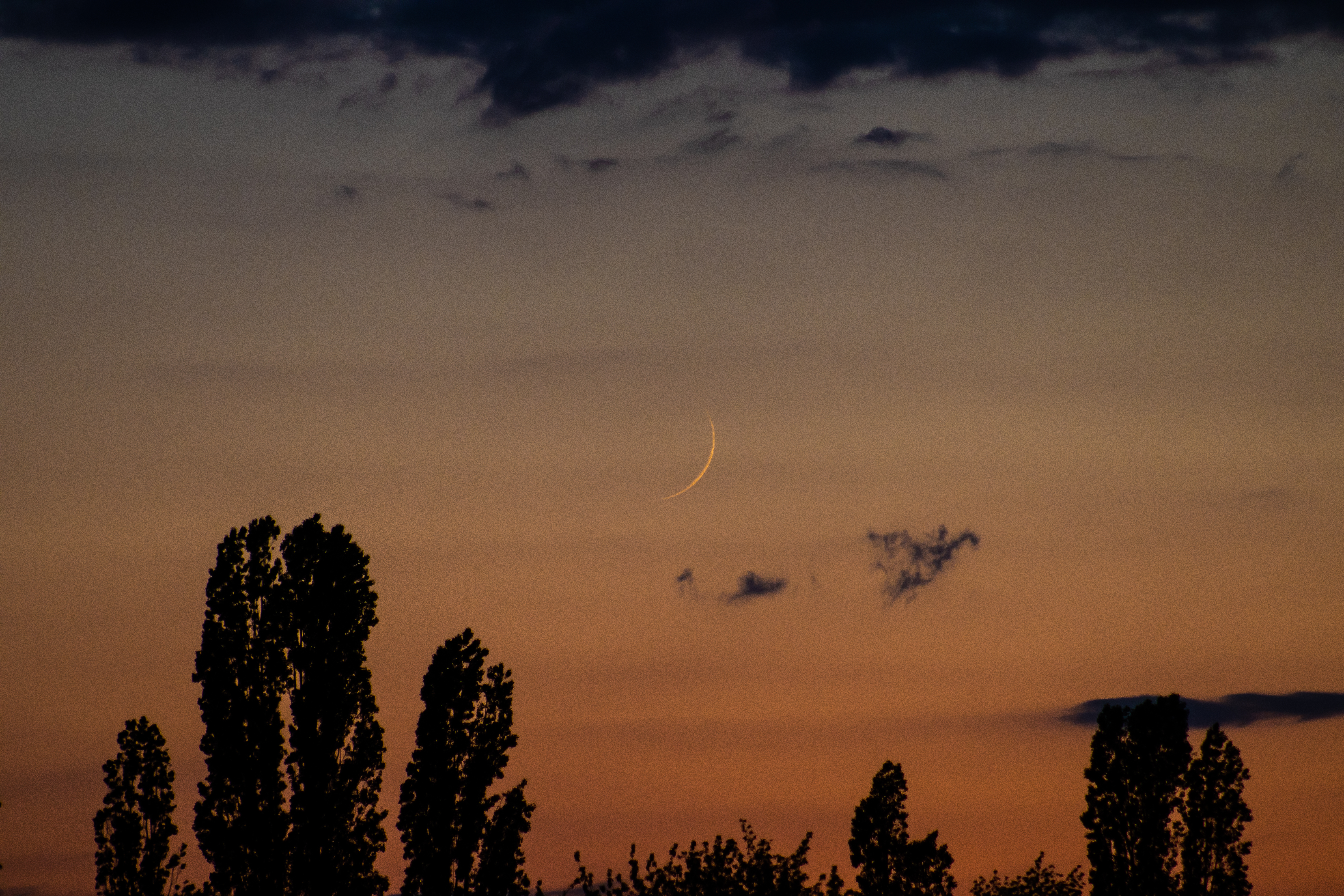 Erste Sichtbarkeit der sehr dünnen Mondsichel nach etwas mehr als 37 Stunden nach Neumond. Aufgenommen in Sobrigau südlich von Dresden. Zum Aufnahmezeitpunkt war die zu 2,6 Prozent beleuchtete Sichel noch 3,9 Grad über dem Horizont.