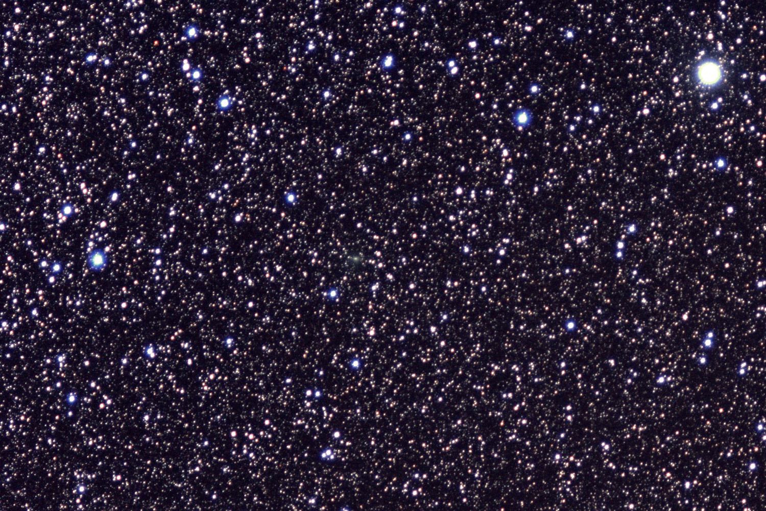 Nachdem Komet 21P/Giacobini-Zinner im September mein fotografisches Ziel war, wollte ich am letzten Wochenende einen weiteren Kometen am Morgenhimmel auf den Sensor bannen. Mit knapp 10 mag Helligkeit befindet sich 38P auch tatsächlich ziemlich genau in der Bildmitte als winziges Nebelchen. Der helle Stern links oben ist Alhena, Gamma Geminorum. Für die aufgeblähten Sterne sorgt der anfangs von mir nicht bemerkte Bodennebel, der dann auch für den Abbruch der Aufnahmeserie sorgte.