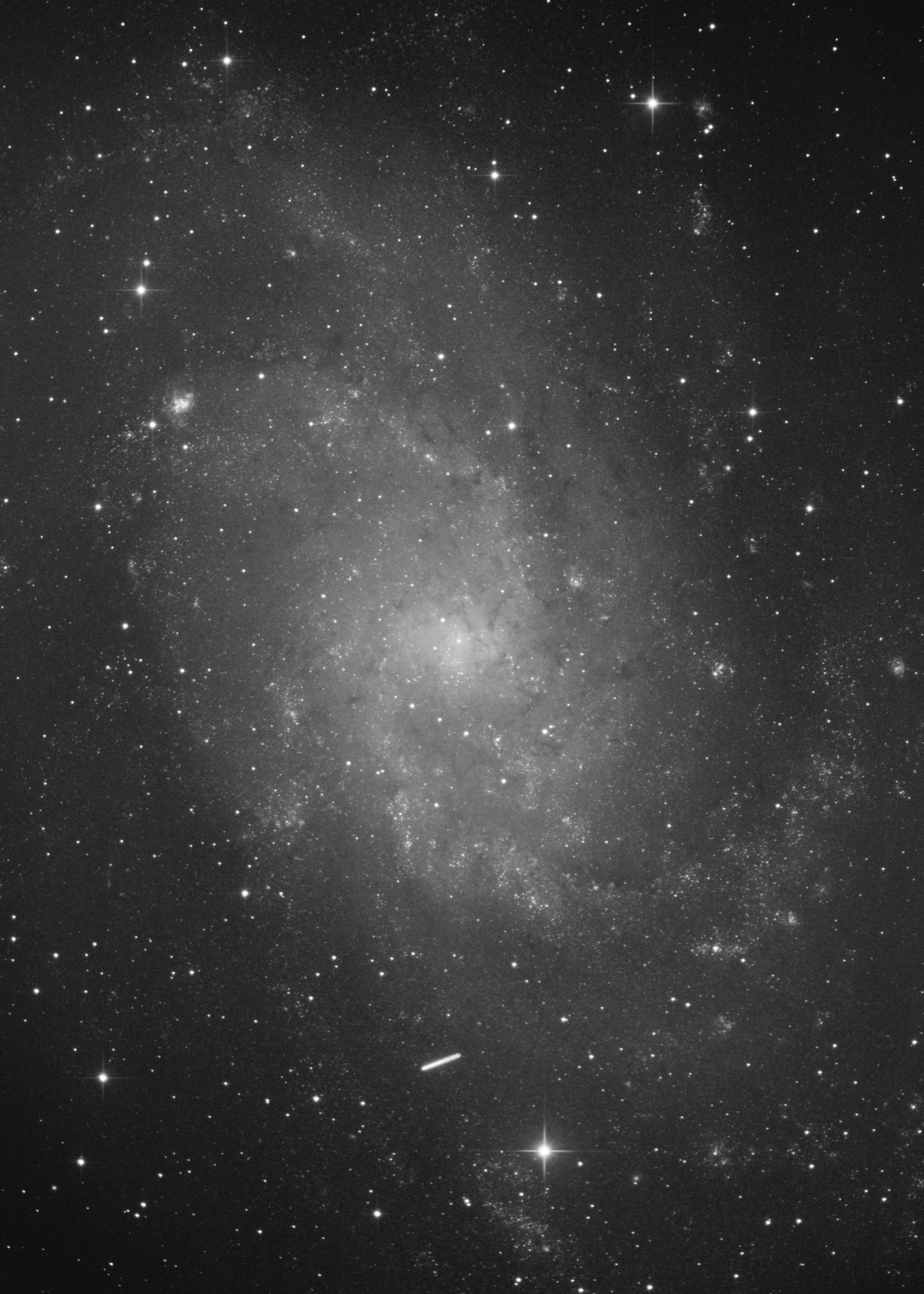 Die Bahn des Kleinplaneten (433) Eros führte Anfang des Jahres bei Messier 33 vorbei. Der Hinweis wurde schon vorab in SuW gegeben und die Hoffnung auf gutes Wetter wurde nicht enttäuscht. Hinzu kam noch eine gute Luftruhe. Durch die relative Erdnähe von Eros zeigte sich sehr schnell seine scheinbare Bewegung am Himmel, die ihn über die südlichen Bezirke von M 33 wandern ließ. Belichtet wurden insgesamt 46 Minuten in denen der Kleinplanet schon über eine Bogenminute zurücklegte.