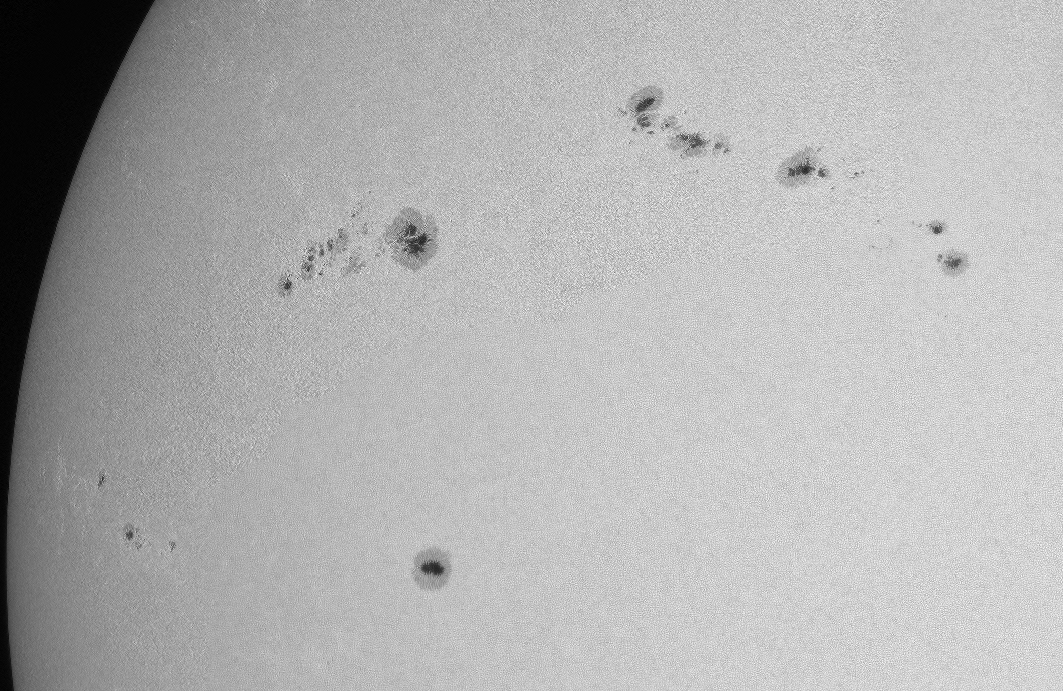 Den zweiten Tag in Folge Sonnenbeobachtung, das war mir in diesem Jahr zum ersten mal möglich. Auf dem nordöstlichen Quadrant der Sonnenscheibe zeigten sich fünf Fleckengruppen, die auf diesem Mosaik aus vier Aufnahmen zu sehen sind, v. l. n. r. AR 3299, AR 3297, AR 3294, AR 3296 und AR 3293. Für die Aufnahmen habe ich auf eine Brennweitenverlängerung verzichtet, die primäre Brennweite meines Instruments beträgt 1440 mm.