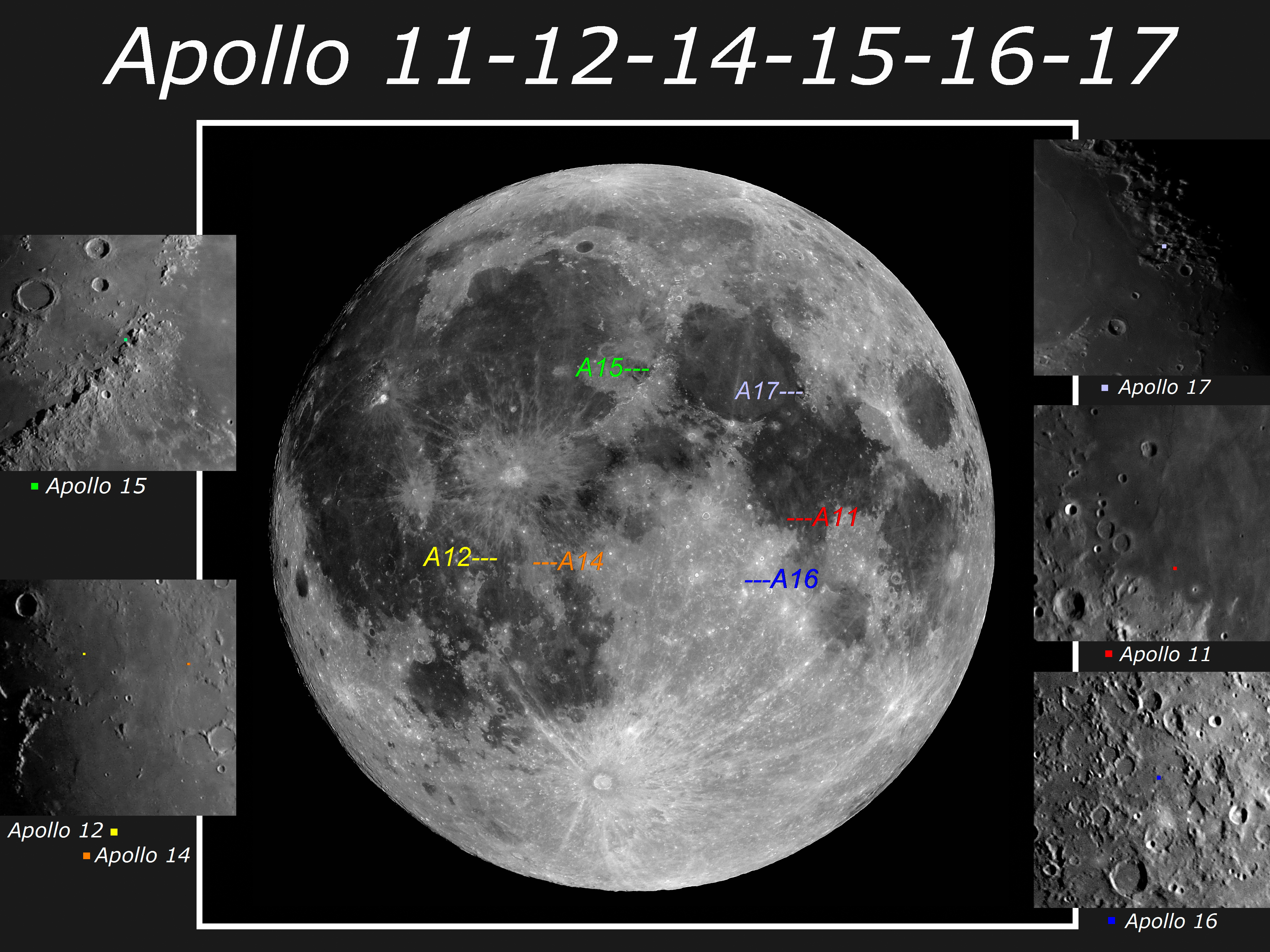 50 Jahre ist es her, das die beiden ersten Menschen Armstrong und Aldrin während der Apollo 11 Mission ihren Fuß auf den Mond gesetzt haben. Damit die Landegebiete einfach aufgefunden werden können, habe ich noch mal eine neue Version meines Bildes hergestellt mit einem aktuellen Übersichtsbild des Mondes vom Januar 2019. Die kleinen Detailbilder sind ältere Aufnahmen mit meinem älteren Meade ED 102 Refraktor, diese entstanden bei günstiger Beleuchtung in der Nähe des Terminators. So sollten die Landegebiete für Fernglas Beobachter (großer Mond) genau so leicht zu finden sein wie für Teleskopbesitzer, diese können sich dann die Landeplätze im Detail ansehen.