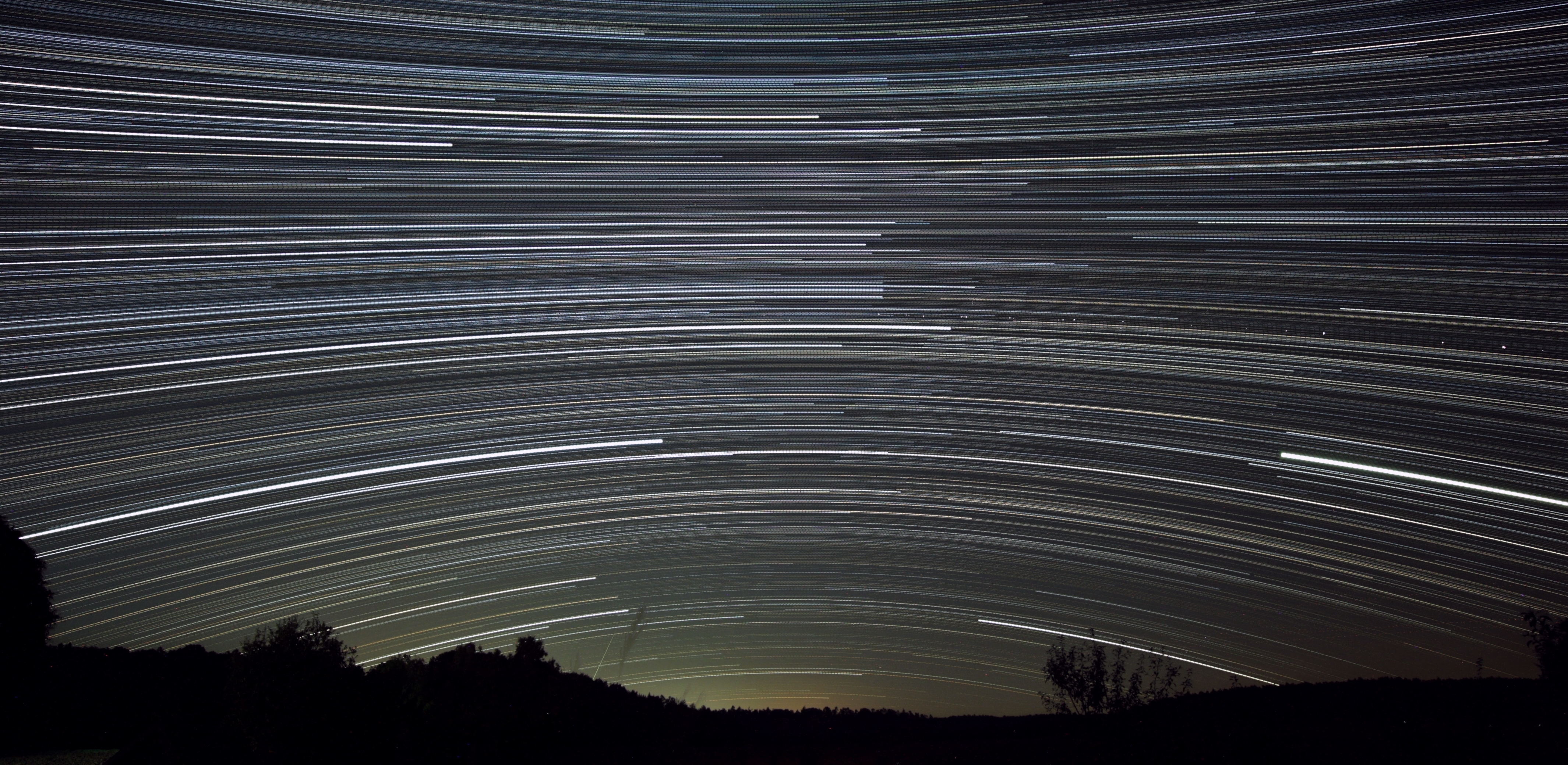 In der Nacht vom 9. auf den 10. Oktober 2021 gelang mir diese sechs Stunden belichtete Strichspuraufnahme des südlichen Sternenhimmels. Man erkennt auch viele geostationäre Satelliten in der Nähe des Himmelsäquators sowie einen Meteor über den Bäumen links von der Bildmitte.