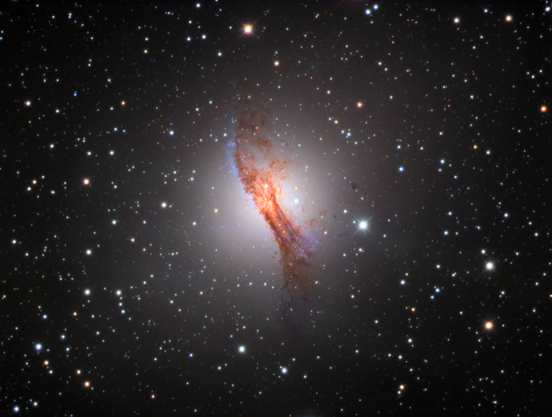 What's the closest active galaxy to planet Earth? And what's the fifth brightest in Earth's sky (though visible from low northern latitudes and the southern hemisphere)? That would be Centaurus A, only 11 million light-years distant. Spanning over 60000 light-years, the peculiar elliptical galaxy is also known as NGC 5128. Forged in a collision of two otherwise normal galaxies, Centaurus A's fantastic jumble of young blue star clusters, pinkish star forming regions, and imposing dark dust lanes are seen here in remarkable detail. The colorful galaxy portrait was recorded under clear Namibian skies at the Southern Sky Gems Observatory at the Kalahari Desert. Near the galaxy's center, left over cosmic debris is steadily being consumed by a central black hole with a billion times the mass of the Sun. As in other active galaxies, that process likely generates the radio, X-ray, and gamma-ray energy radiated by Centaurus A.