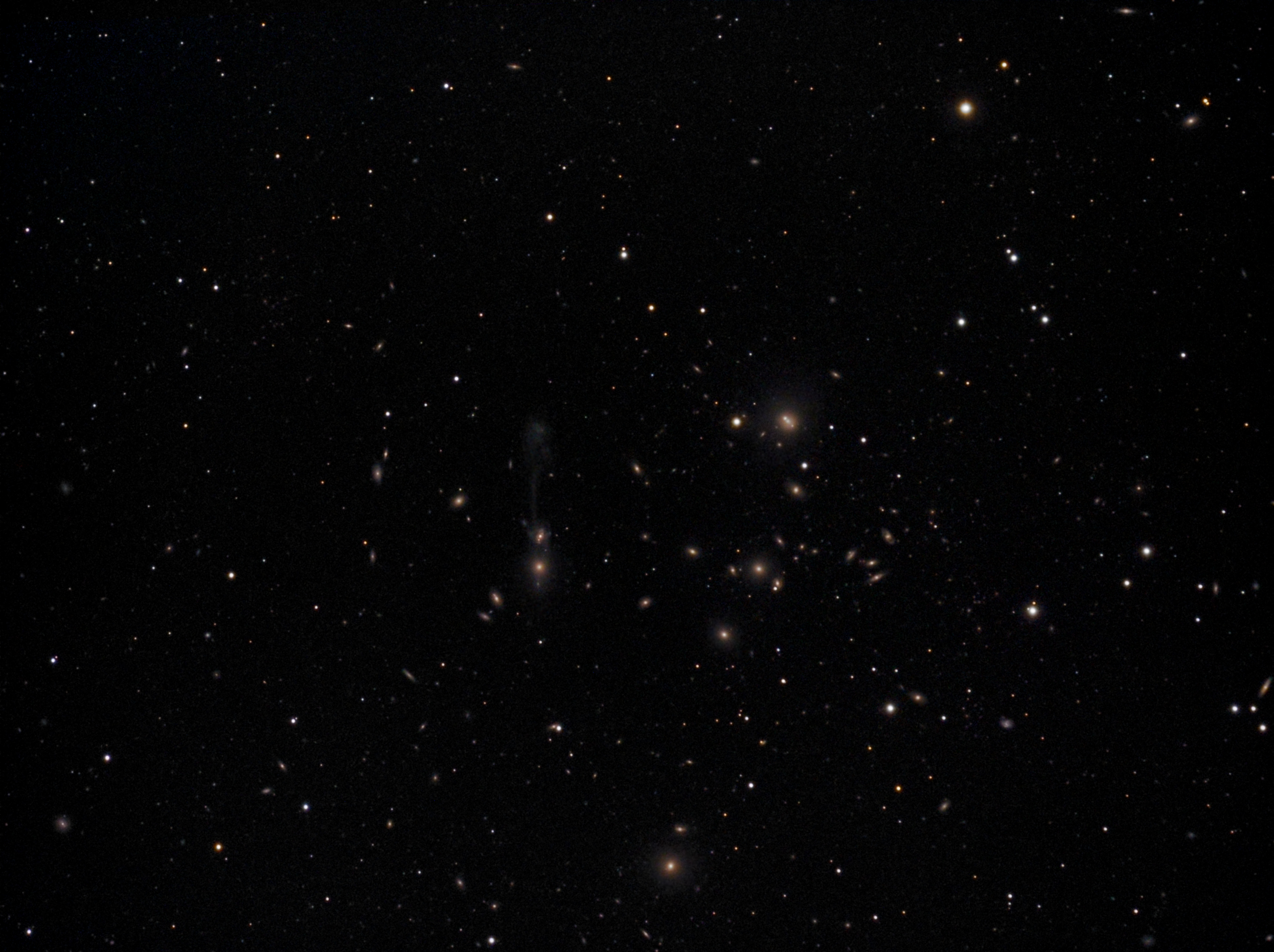 Der Galaxienhaufen Abell 1185 beinhaltet einige sehr interessante interagierende Sternsysteme. Ralf Mündlein hat mit mir gleichzeitig die Aufnahme durchgeführt. Dabei steuerte er die Luminanzaufnahmen bei und ich nahm zeitgleich die RGB-Bilder auf. Leider kämpften wir an verschiedenen Orten zeitversetzt mit den Wolken. Die Tiefe beeindruckte uns aber am Ende doch beide.