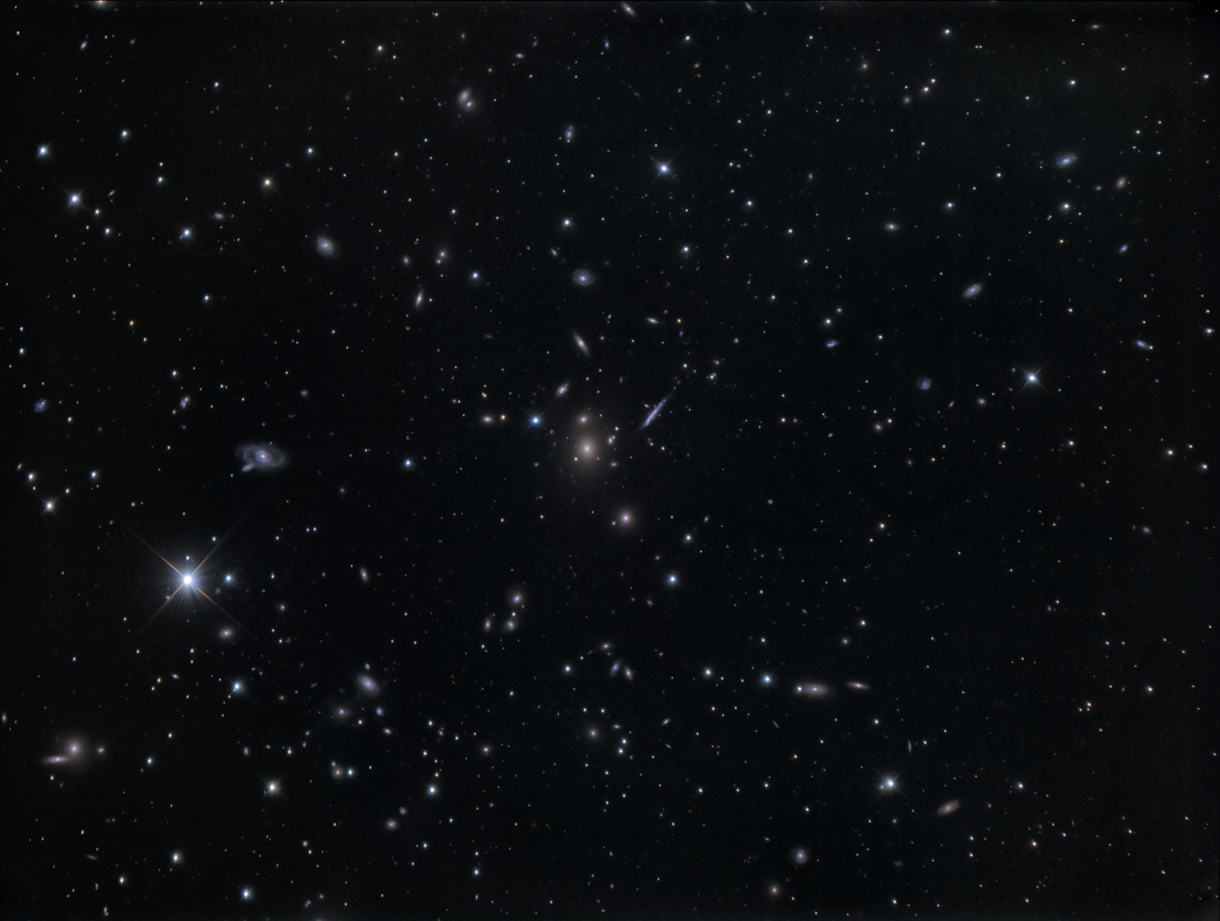 Der Leo Super-Galaxienhaufen Abell 1367 war Ziel einer Belichtungsserie, die dank guter Bedingungen innerhalb einer Nacht geschehen konnte. Fasziniert bin ich von der großen Anzahl an Galaxien, die in einer Entfernung von rund 300 Millionen Lichtjahren stehen. Darüber hinaus befinden sich um die zentrale Galaxie NGC 3842 drei Quasare, deren schwächster mit 21 mag eine Lichtlaufzeit von rund zwölf Milliarden Jahren aufweist.