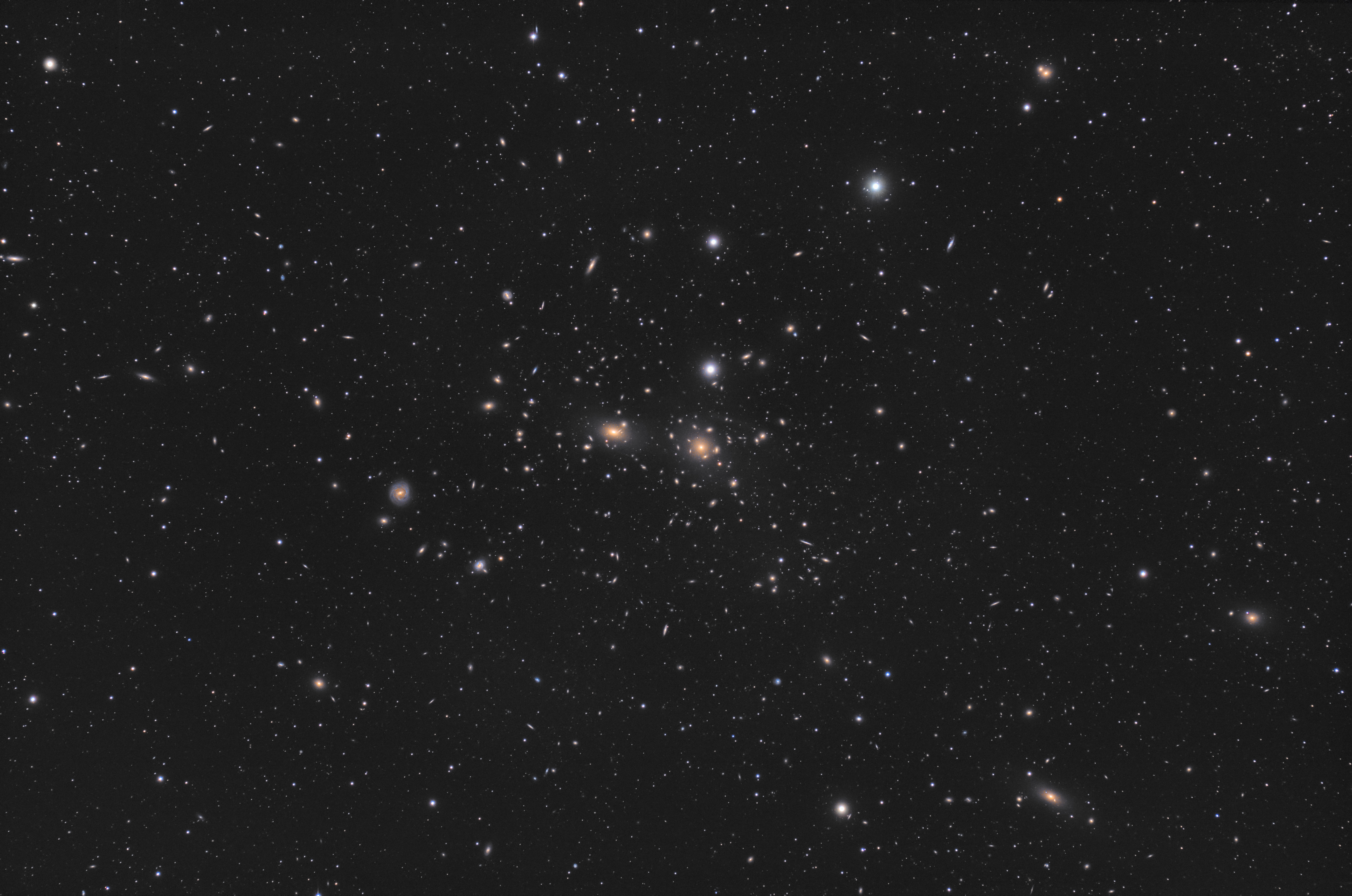 Der Coma-Galaxienhaufen liegt in einer Entfernung von 310 Millionen Lichtjahren und besteht aus 3000 Galaxien. In seinem Zentrum befinden sich die beiden Galaxien NGC 4874 und NGC 4889. Die linke der beiden Galaxien, NGC 4889, ist etwa zweieinhalb Mal so groß, wie unsere Milchstraße. Es sieht fast so aus, als wären auf der Aufnahme, zumindest im Zentrum, mehr Galaxien als Sterne zu sehen.