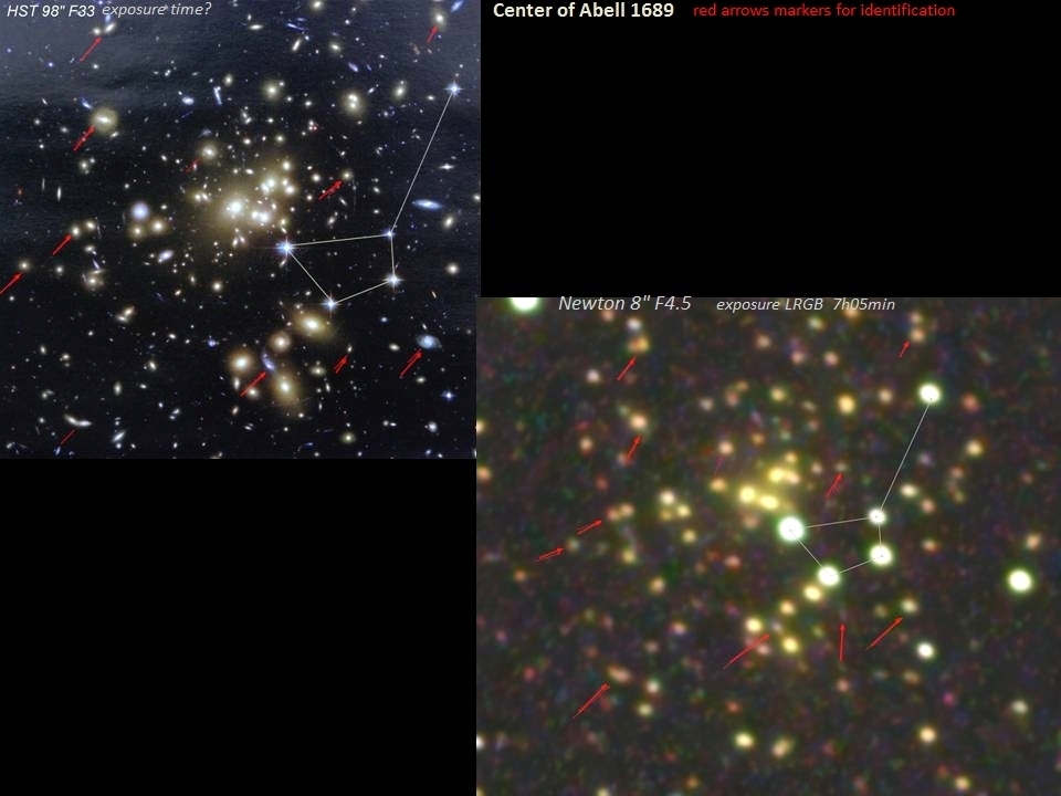 Hier sind die HST Aufnahme und ein kontrastverstärkter und größenangepasster Ausschnitt zum Vergleich nebeneinanderkopiert. Rote Pfeile identifizieren diverse Galaxien auf beiden Bildern. Vergleichen Sie die instrumentellen Daten! Es ist erstaunlich, was man heute mit kleinen Instrumenten zustande bringen kann. Das Entfernungslimit des 5-m-Spiegels auf dem Mount Palomar betrug 1960 ca. 300 Millionen Lichtjahre (bei 23,5 mag).