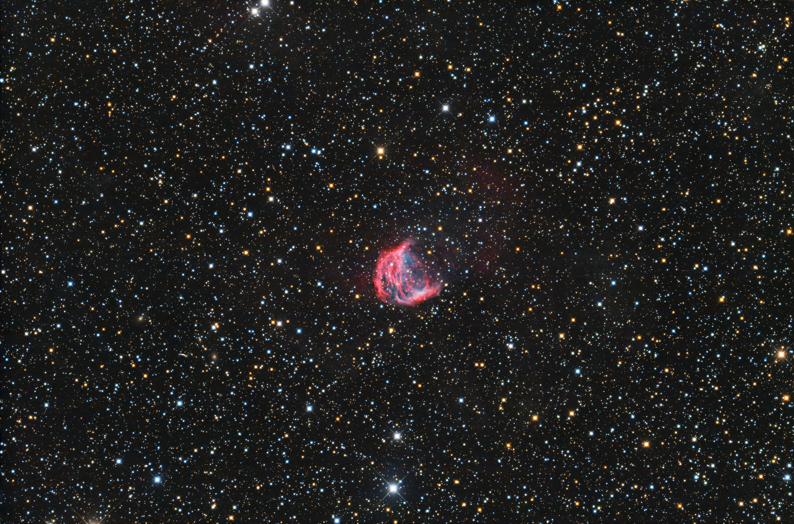 Abell 21, besser bekannt als Medusanebel, ist ein großer Planetarischer Nebel im Sternbild Zwillinge (Gemini). Er entstand, als ein sonnenähnlicher Stern in seiner Spätphase seine äußeren Hüllen abgestoßen hat. Mit einem scheinbaren Durchmesser von rund 10 Bogenminuten wirkt er am Himmel relativ ausgedehnt, aber sehr lichtschwach. Die Entfernung liegt grob bei etwa 1500 Lichtjahren (je nach Quelle mit Unsicherheiten). Seine auffälligen, faserigen Strukturen und Bögen erinnern an Tentakel und gaben ihm den Namen Medusanebel. Das Zentralobjekt ist ein heißer, kompakter Sternrest (Weißer Zwerg), dessen UV-Strahlung das Gas zum Leuchten anregt. Fotografisch zeigt Abell 21 besonders starke Emissionen in [O III] (blaugrün) sowie Hα (rot). Visuell ist er anspruchsvoll, gelingt aber mit größerer Öffnung und OIII-Filter unter dunklem Himmel deutlich besser.